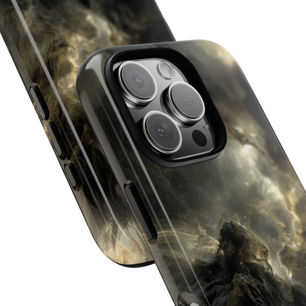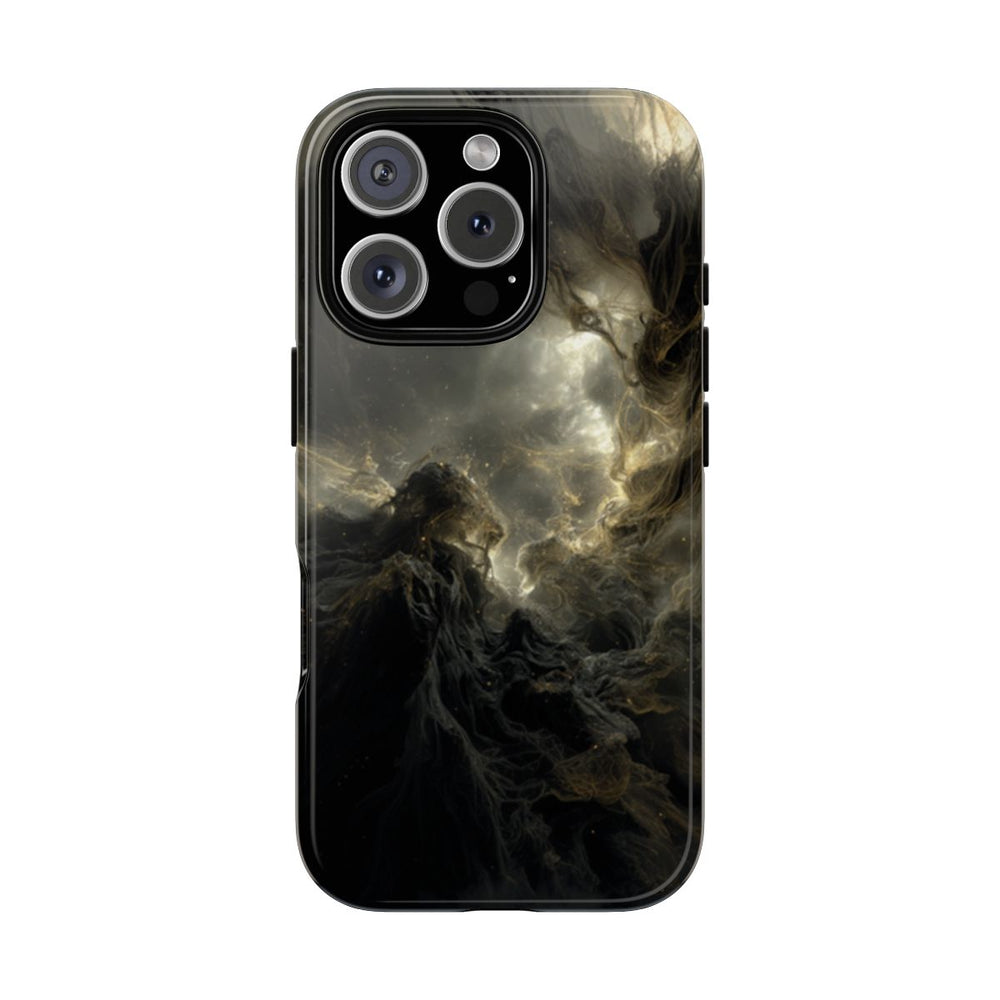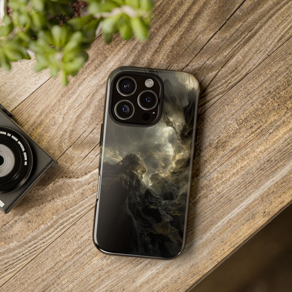 Dit telefoonhoesje heeft een abstract ontwerp met wervelende schaduwen en lichtstrengen in donkere en goudkleurige tinten. De vloeiende, verstrengelde vormen zorgen voor diepte en beweging tegen een donkere achtergrond. Oplichtende gouden deeltjes geven extra contrast en structuur. Het hoesje is glanzend, stevig en bestaat uit een polycarbonaat buitenkant met een TPU-binnenzijde, waardoor het duurzaam is en geschikt voor gebruik buitenshuis. Ondersteunt draadloos opladen.