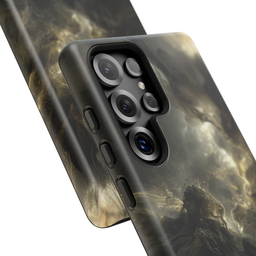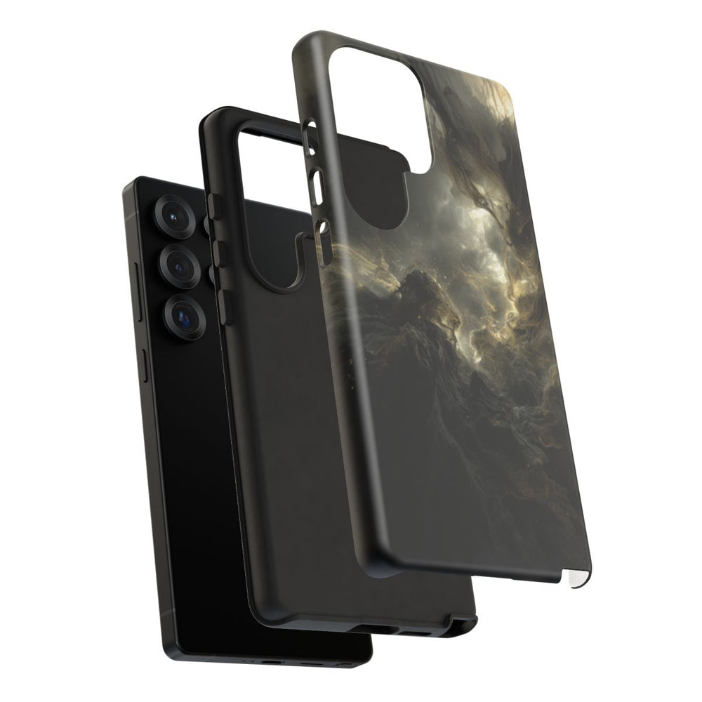 Dit telefoonhoesje heeft een abstract ontwerp met wervelende vormen die doen denken aan kosmische schaduwen en lichtstrengen in donkere en goudkleurige tinten. De afbeelding toont gedetailleerde, vloeiende texturen met een mix van diepzwart en grijstinten, subtiel aangevuld met gouden accenten. Het hoesje bestaat uit twee lagen van polycarbonaat en TPU, wat zorgt voor extra stevigheid en bescherming. Geschikt voor draadloos opladen.