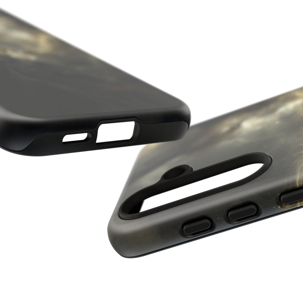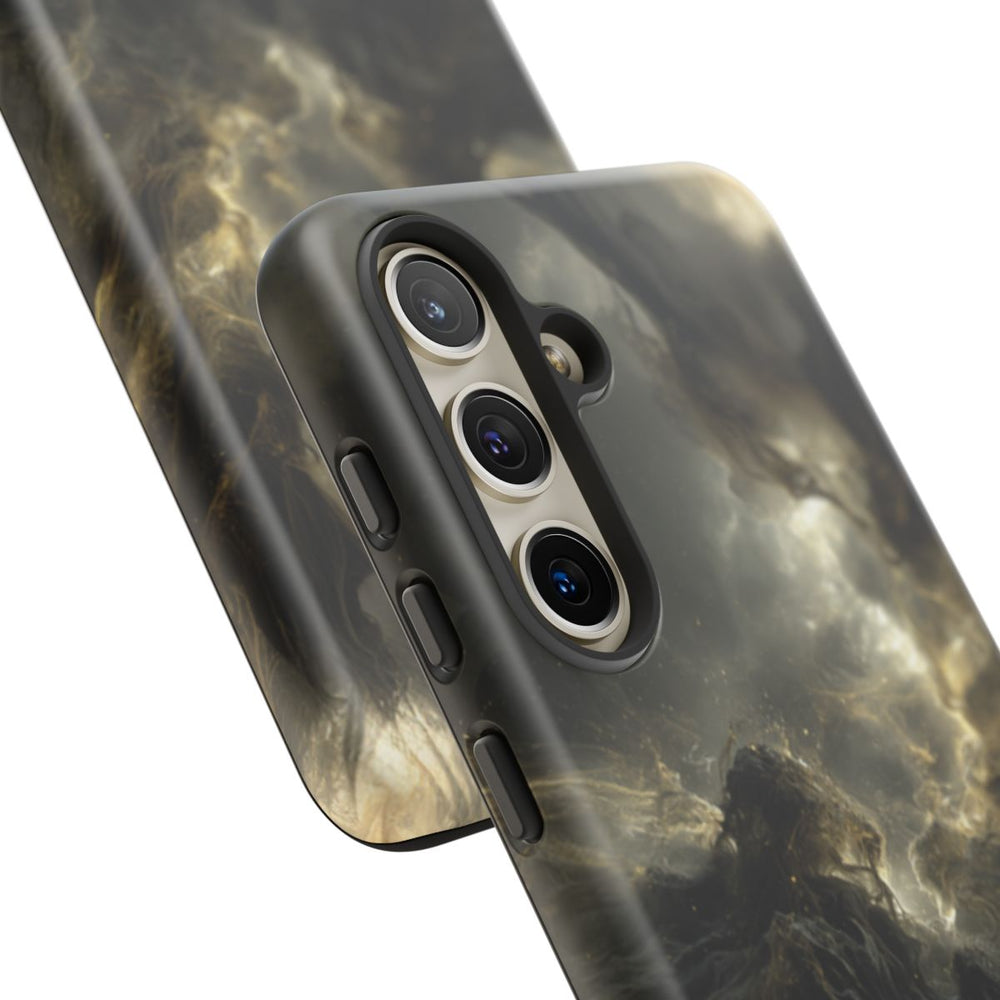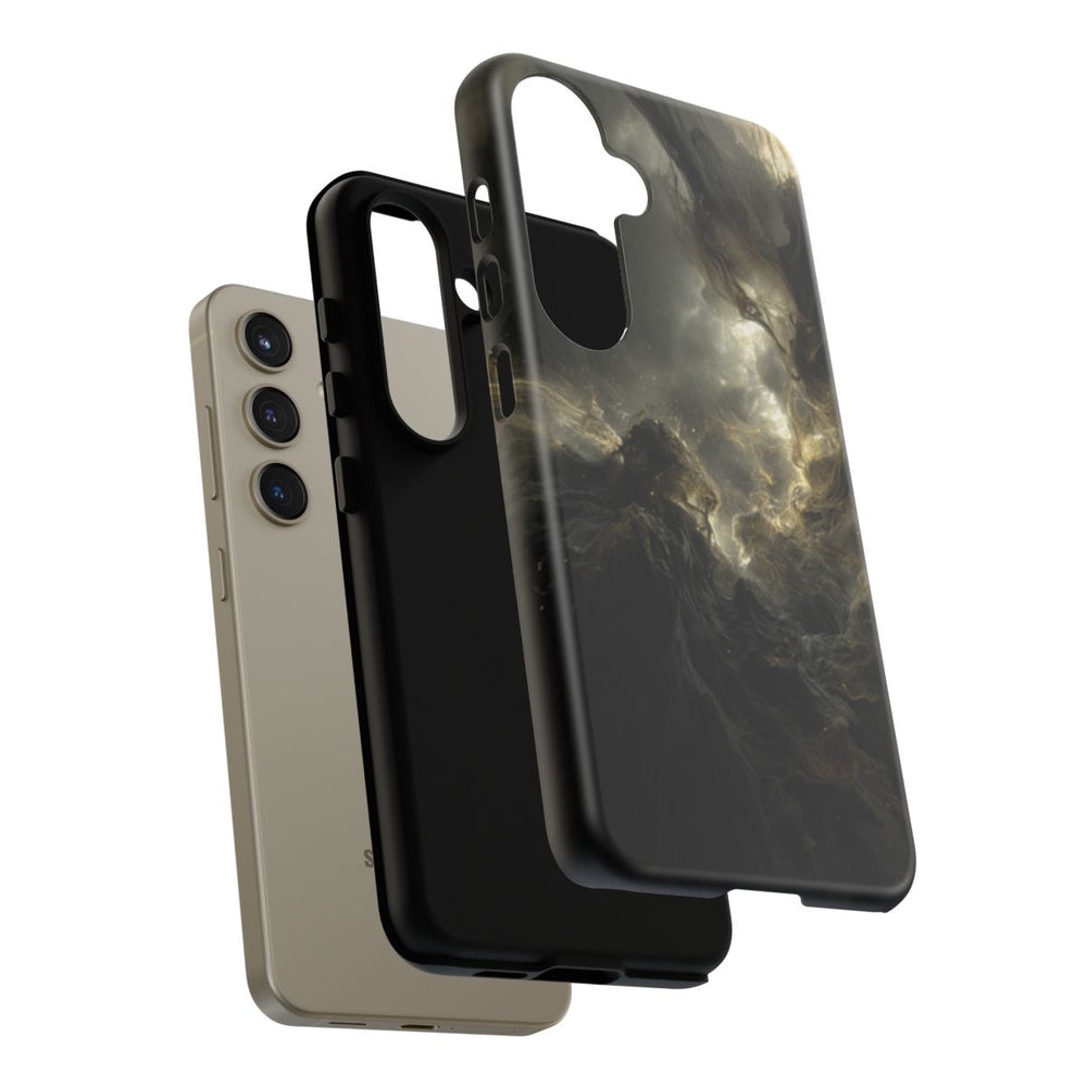 Dit ontwerp toont een abstracte compositie van wervelende donkere schaduwen en sluiers met gouden accenten, wat zorgt voor een dynamisch en mysterieus kosmisch effect. Je ziet vloeiende, verstrengelde lijnen en rokerige texturen op een donkere achtergrond, met subtiel verspreide lichtpuntjes. Het hoesje heeft een dubbele laag, een matte afwerking en is gemaakt van polycarbonaat en TPU. Geschikt voor draadloos opladen en speciaal ontworpen voor een specifiek smartphone model.