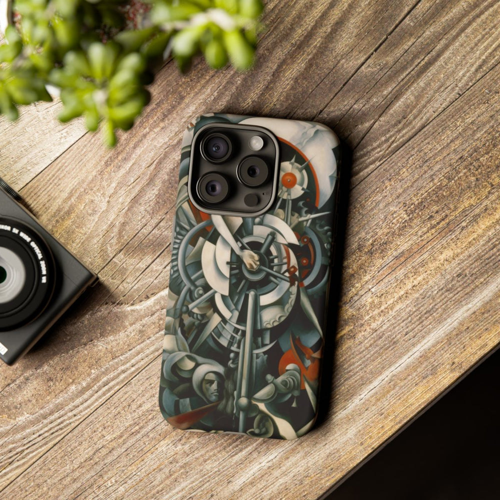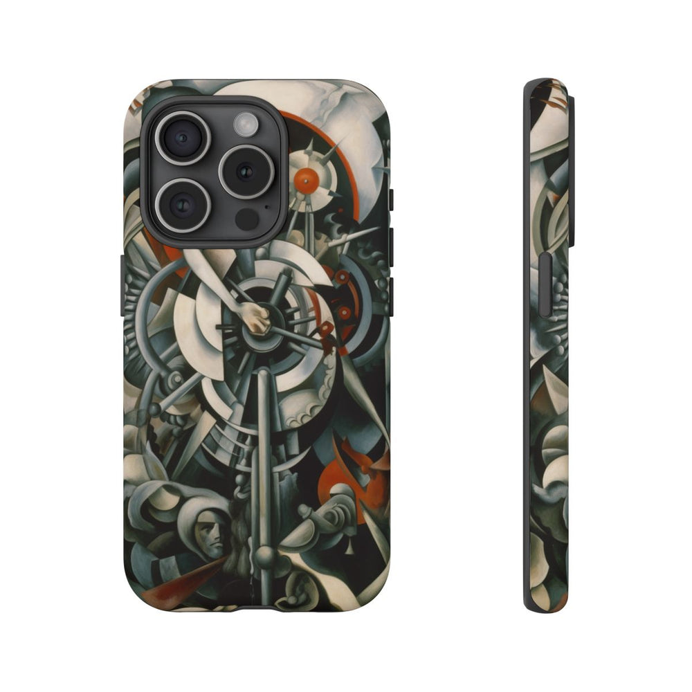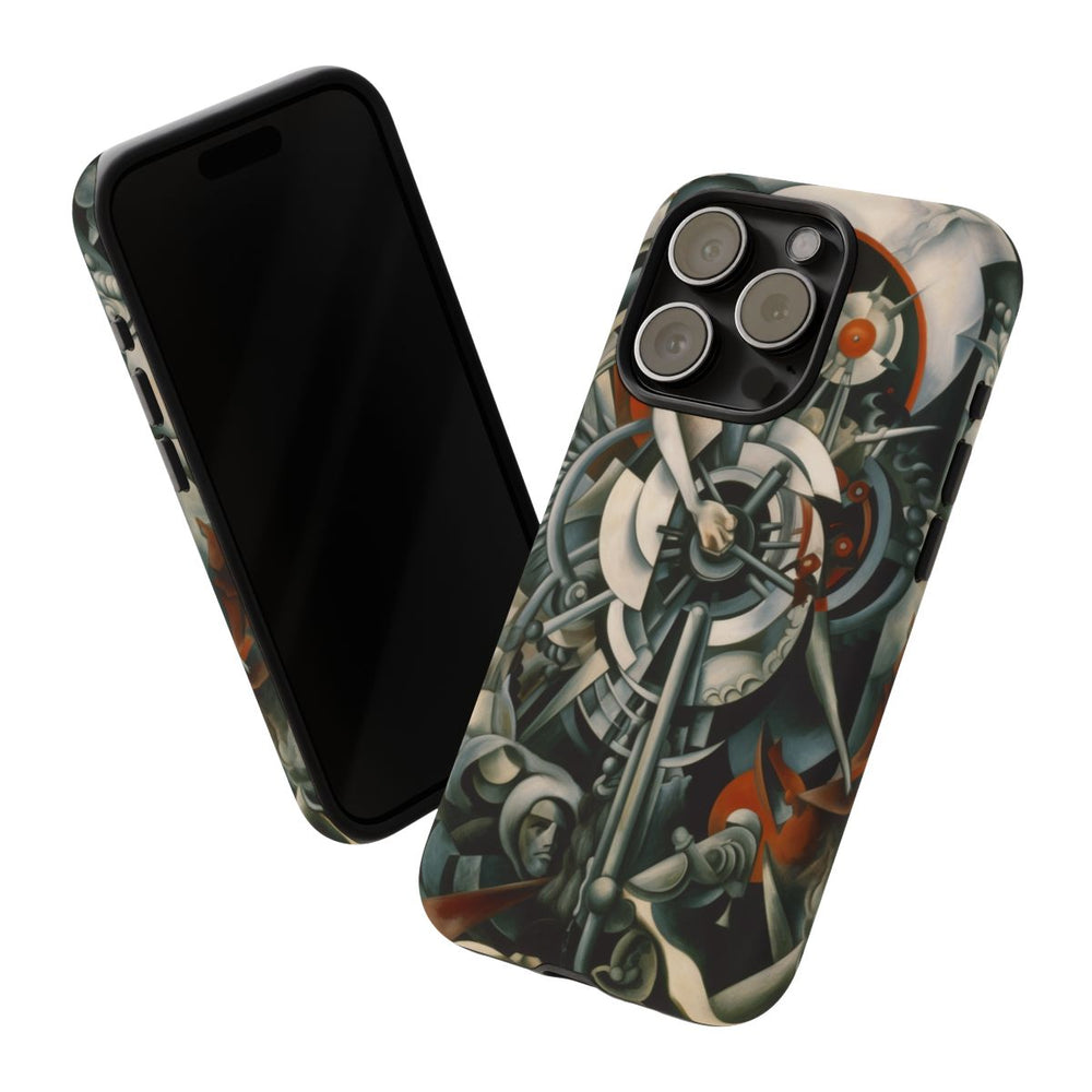 Dit hoesje is voorzien van een abstract ontwerp met een geometrische compositie, waarin een centrale figuur een complex mechanisch apparaat bedient. Het kunstwerk bestaat uit scherpe lijnen en ronde vormen en gebruikt een beperkt kleurenpalet met grijs-, zwart- en wittinten, aangevuld met dieprood-oranje accenten. De afbeelding straalt een gevoel van industriële beweging en kracht uit door de dynamische vormen en gelaagde elementen. Het hoesje bestaat uit twee lagen: een stevige polycarbonaat buitenkant en een TPU-binnenzijde. Geschikt voor draadloos opladen.