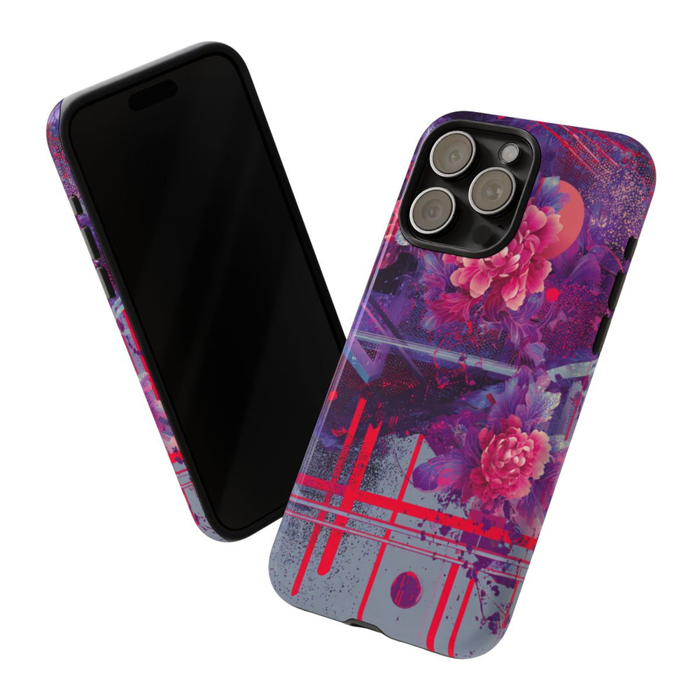 Dit hoesje heeft een opvallend ontwerp met levendige roze en paarse bloemen op een diep paarse en blauwe achtergrond. Heldere rode lijnen en geometrische vormen kruisen het geheel en zorgen voor een krachtig contrast. Spatjes en getextureerde stippen geven het ontwerp extra diepte en dynamiek. De stijl combineert bloemmotieven met abstracte geometrische patronen tot een harmonieus en opvallend geheel. Het hoesje is glanzend, stevig en gemaakt van duurzame materialen. Geschikt voor draadloos opladen.