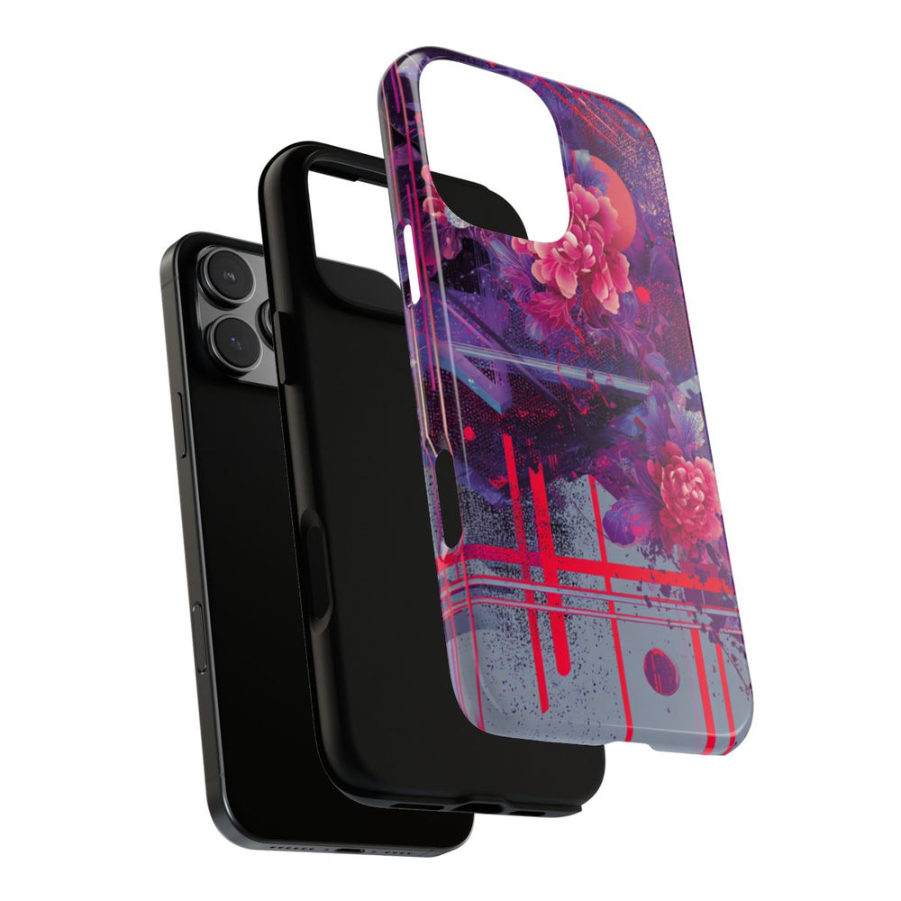 Dit hoesje heeft een opvallend ontwerp met levendige roze en paarse bloemen op een diep paarse en blauwe achtergrond. Heldere rode lijnen en geometrische vormen kruisen het geheel en zorgen voor een krachtig contrast. Spatjes en getextureerde stippen geven het ontwerp extra diepte en dynamiek. De stijl combineert bloemmotieven met abstracte geometrische patronen tot een harmonieus en opvallend geheel. Het hoesje is glanzend, stevig en gemaakt van duurzame materialen. Geschikt voor draadloos opladen.