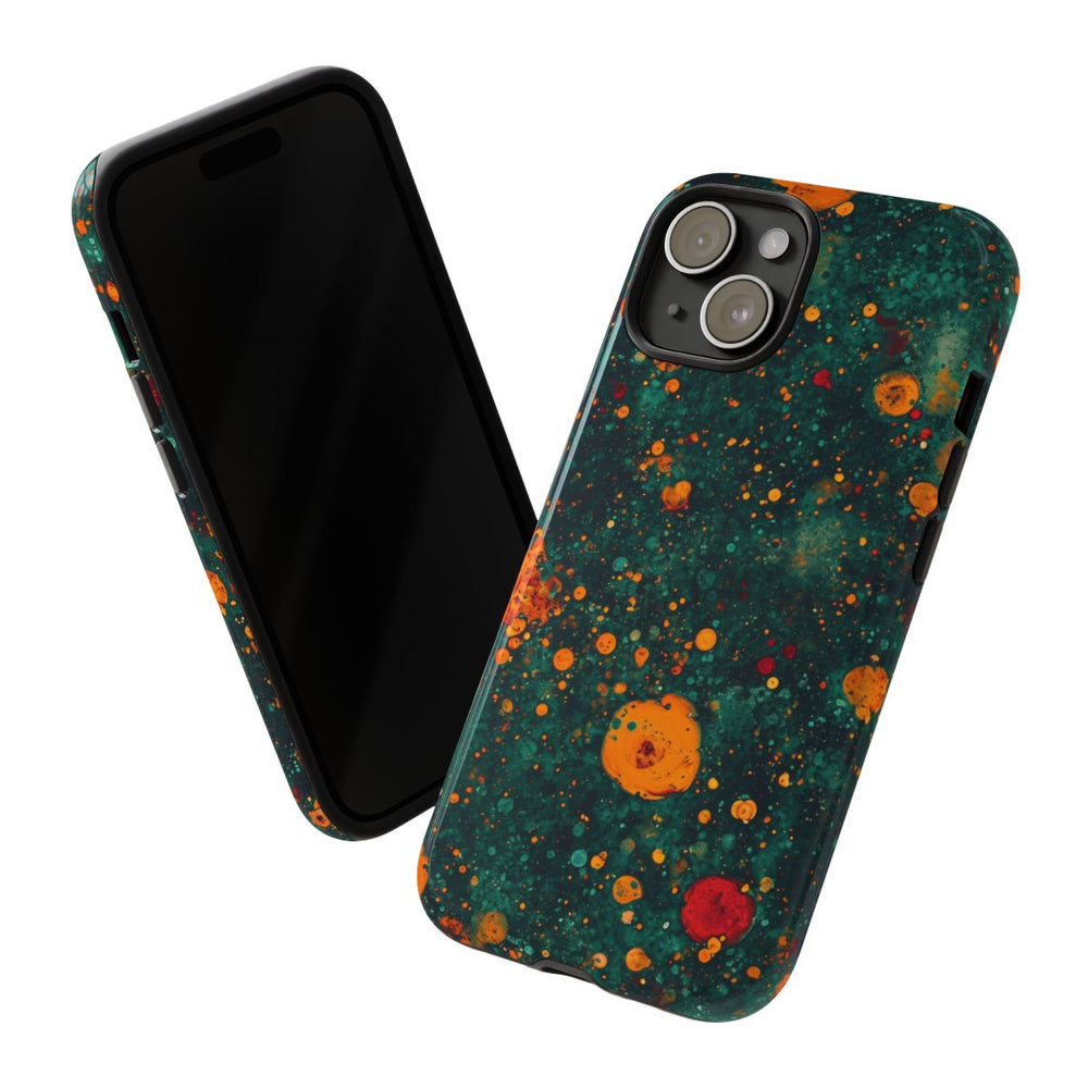 Dit telefoonhoesje heeft een abstract patroon met een donker teal achtergrond, bezaaid met oranje, rode en licht teal cirkelvormige vormen die doen denken aan bellen of druppels. Het ontwerp oogt bijna kosmisch door de clusters van kleine stippen en grotere, onregelmatige cirkels die over het geheel verspreid zijn. Het hoesje is glanzend en stevig, met een buitenkant van polycarbonaat en een binnenkant van TPU voor dubbele bescherming. Geschikt voor draadloos opladen. De levendige combinatie van oranje en teal zorgt voor een opvallend en krachtig visueel effect.