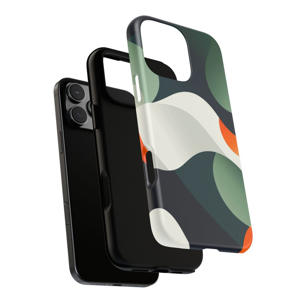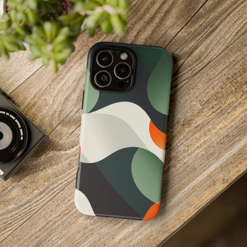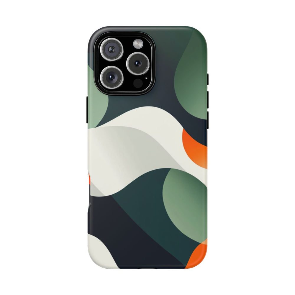 Geef jouw telefoon een stijlvolle uitstraling met dit matte hoesje, voorzien van een opvallend ontwerp met abstracte organische vormen in groen, oranje en donkerblauw. Geïnspireerd op moderne Scandinavische stijlen, komen vloeiende lijnen en gelaagde elementen samen voor een aantrekkelijk geheel. Het hoesje is gemaakt van een dubbele laag 100% polycarbonaat met een binnenzijde van 100% TPU, waardoor jouw toestel uitstekend beschermd blijft en draadloos opladen mogelijk blijft. Dankzij het minimalistische ontwerp en de ruime witte vlakken oogt het hoesje strak en professioneel – ideaal voor wie waarde hecht aan zowel stijl als functionaliteit.