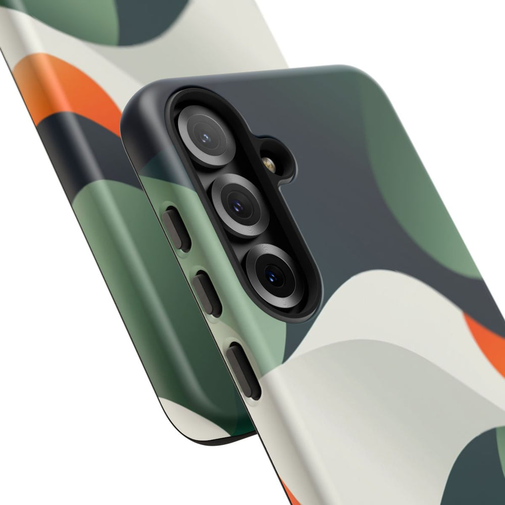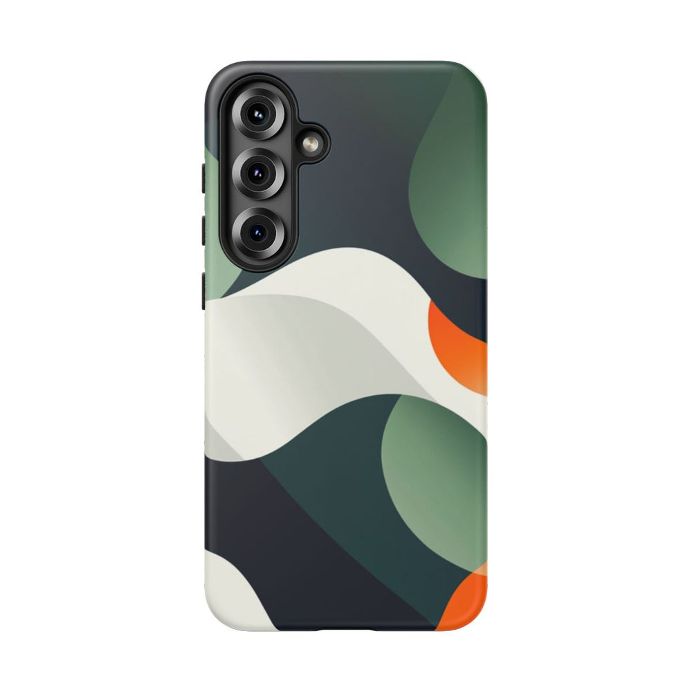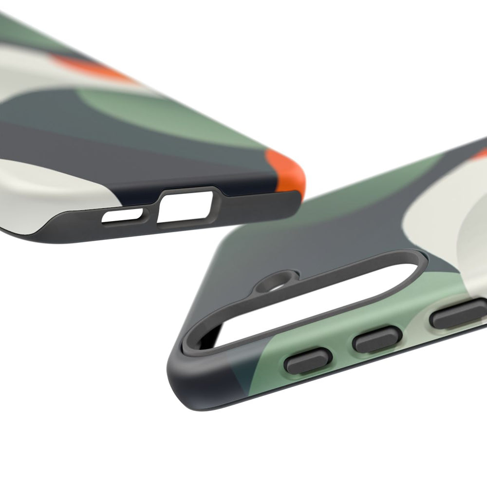 Geef jouw telefoon een stijlvolle uitstraling met dit matte hoesje, voorzien van een opvallend ontwerp met abstracte organische vormen in levendig groen, oranje en donkerblauw. Het strakke, moderne design met vloeiende lijnen en een minimalistische indeling straalt betrouwbaarheid en milieubewustzijn uit. Dankzij de dubbele laag van 100% polycarbonaat en TPU-binnenzijde biedt dit hoesje optimale bescherming en duurzaamheid, en is het geschikt voor draadloos opladen. Ideaal voor iedereen die kunstzinnigheid en functionaliteit weet te waarderen.