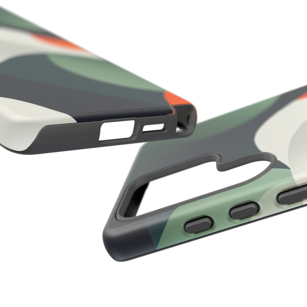 Geef jouw toestel een stijlvolle uitstraling met dit matte, stevige hoesje met een opvallend patroon van abstracte organische vormen in levendig groen, oranje en donkerblauw. Het strakke, moderne ontwerp is geïnspireerd op een minimalistische Scandinavische stijl en zorgt voor een professionele look. Dankzij de stevige dubbele laag biedt het hoesje uitstekende bescherming en is het geschikt voor draadloos opladen. De vloeiende lijnen en gelaagde details geven het hoesje een uniek karakter, ideaal voor liefhebbers van eigentijds design.