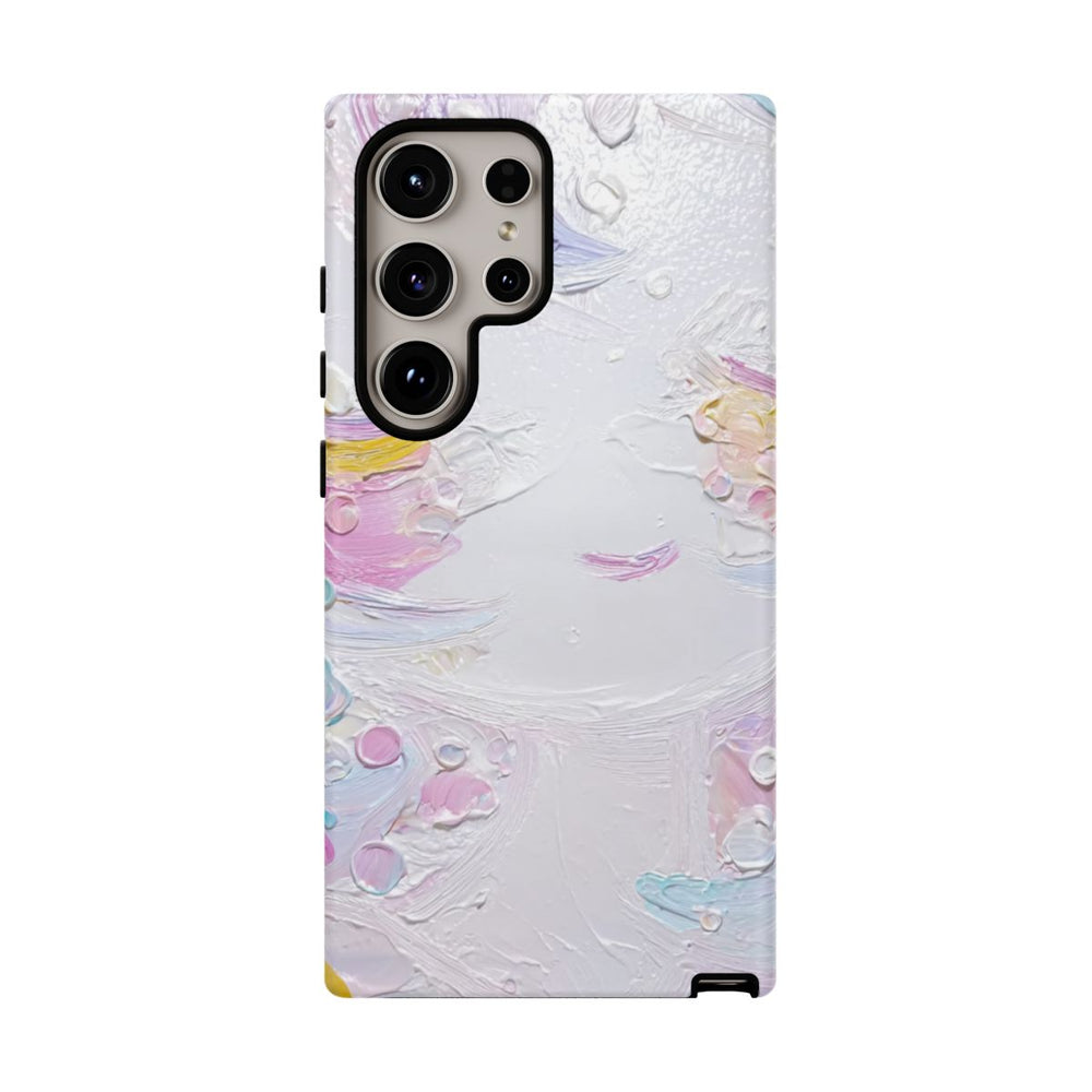 Dit telefoonhoesje is voorzien van een abstract schilderij met zachte pastelkleuren zoals roze, geel, blauw en lila. Het ontwerp toont grove penseelstreken en reliëfachtige verfdruppels op een overwegend witte achtergrond. De textuur zorgt voor een tastbaar, gelaagd effect en geeft het hoesje een dromerige en verfijnde uitstraling. De afbeelding is gedrukt op een mat hoesje van polycarbonaat en TPU, dat bestaat uit twee beschermende lagen en geschikt is voor draadloos opladen.