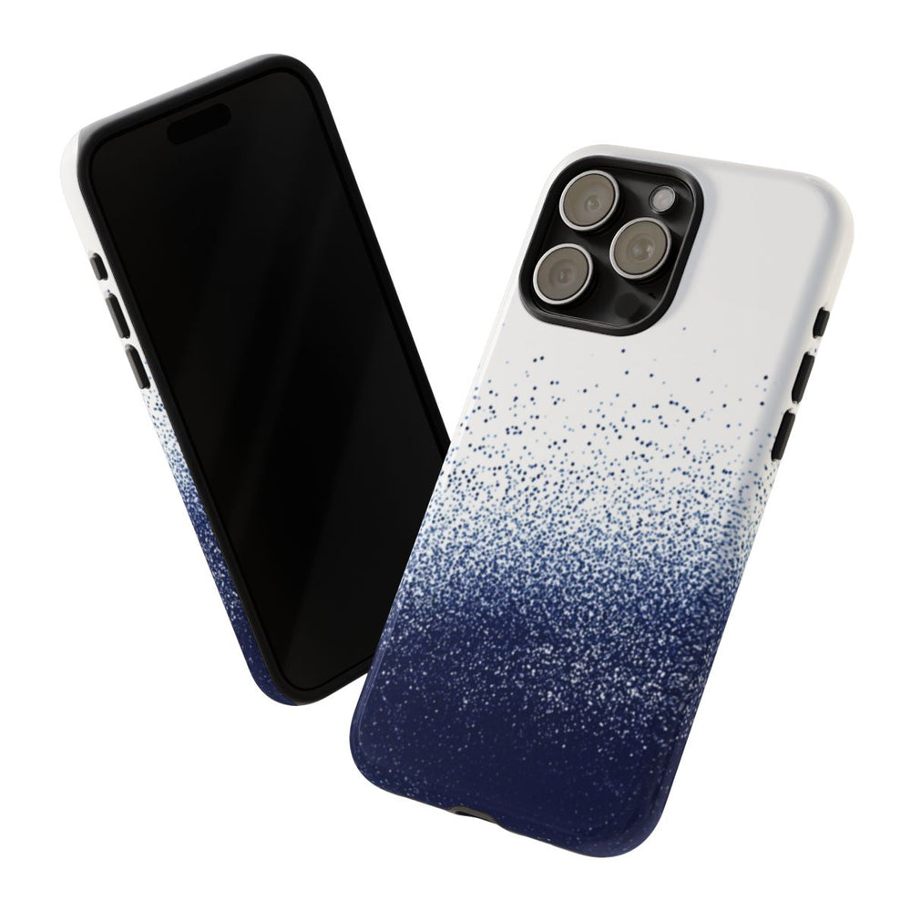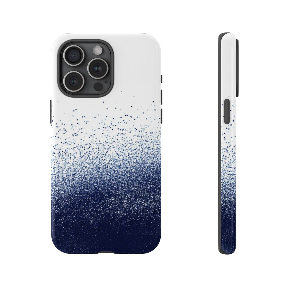 Dit hoesje heeft een abstract patroon van kleine donkerblauwe stippen, die onderaan dicht op elkaar staan en naar boven toe geleidelijk uitwaaieren op een witte achtergrond. De stippen zorgen voor een korrelig, getextureerd verloop van donkerblauw naar lichtere tinten, wat diepte en beweging aan het ontwerp geeft. Het hoesje is glanzend en extra stevig dankzij de dubbele laag van een polycarbonaat buitenkant en een TPU-binnenzijde. Dit biedt optimale bescherming en duurzaamheid. Geschikt voor draadloos opladen, maar niet voor MagSafe.