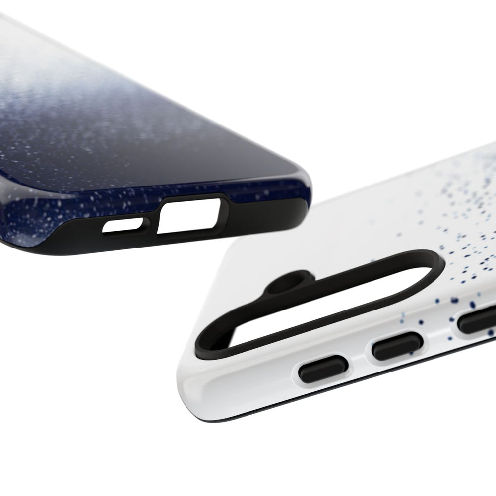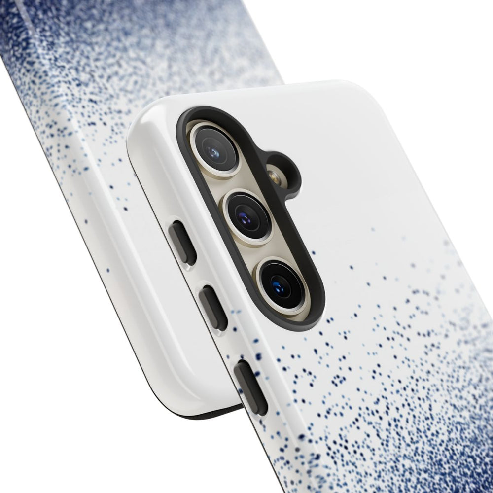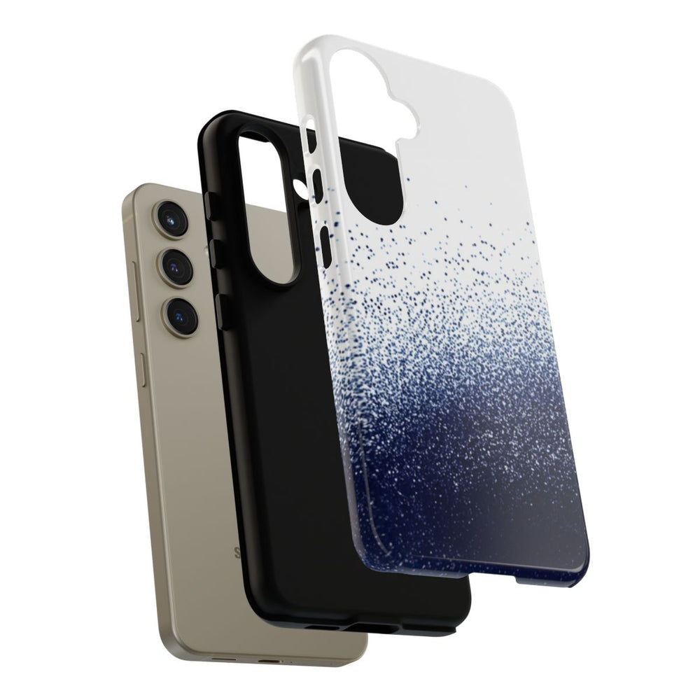 Dit hoesje heeft een abstract patroon van kleine, donkerblauwe stippen die onderaan dicht bij elkaar staan en naar boven toe steeds verder uit elkaar lopen op een witte achtergrond. De stippen zorgen voor een korrelig, getextureerd verloop van diep donkerblauw naar lichtere tinten, wat diepte en beweging aan het ontwerp geeft. Het hoesje is glanzend afgewerkt en bestaat uit twee lagen: een stevige polycarbonaat buitenkant en een TPU binnenzijde voor extra stevigheid en bescherming. Het hoesje ondersteunt draadloos opladen, maar is niet geschikt voor MagSafe.