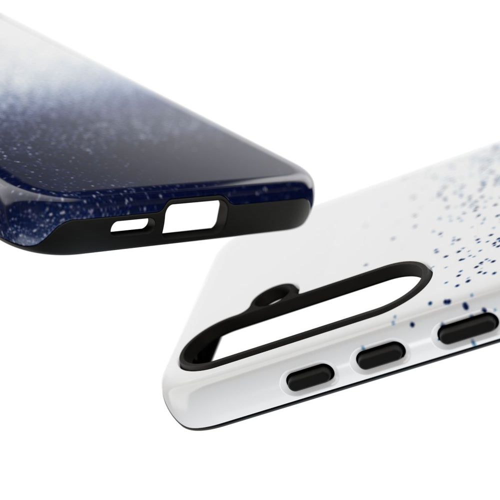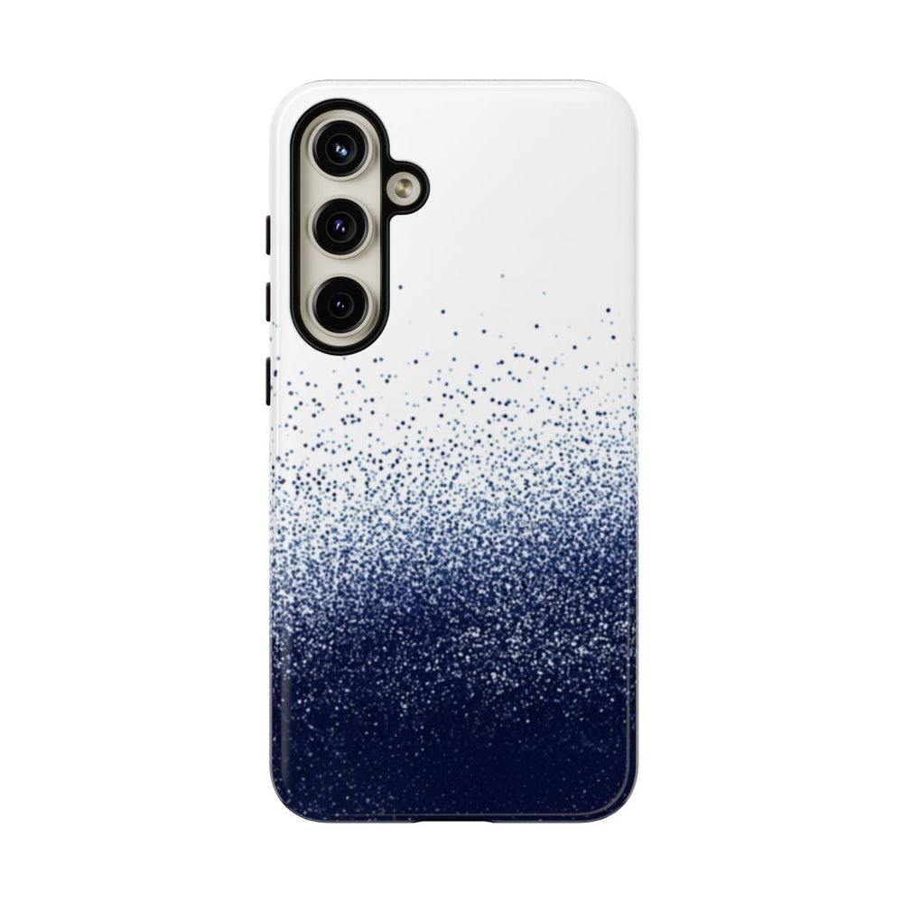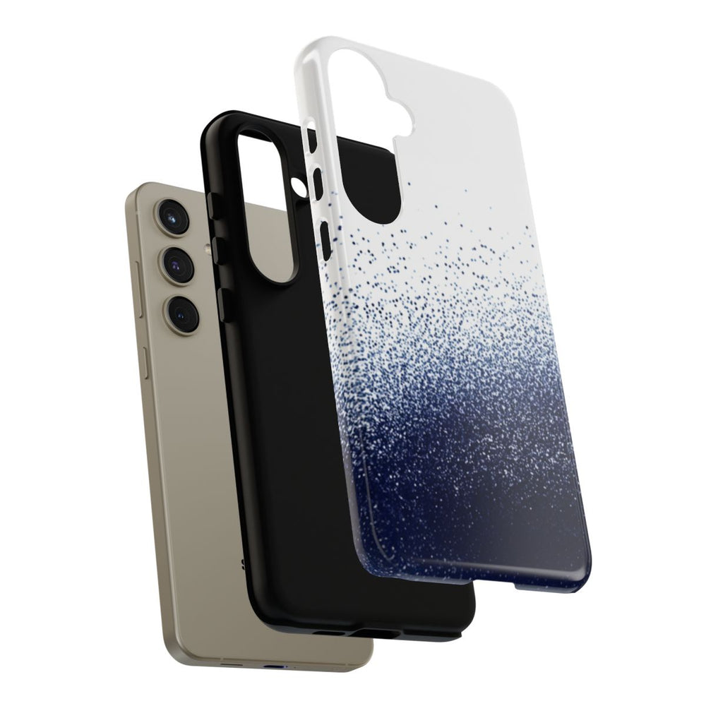Dit hoesje heeft een abstract patroon van puntjes, waarbij talloze kleine donkerblauwe stippen dicht bij elkaar onderaan het hoesje staan en geleidelijk naar boven toe uitwaaieren op een witte achtergrond. De stippen zorgen voor een korrelig, getextureerd verloop van donkerblauw naar lichtere tinten, wat diepte en beweging geeft aan het ontwerp. Het hoesje is glanzend en extra stevig dankzij de dubbele laag van een polycarbonaat buitenkant en een TPU-binnenzijde. Het biedt optimale bescherming en is geschikt voor draadloos opladen, maar niet voor MagSafe.