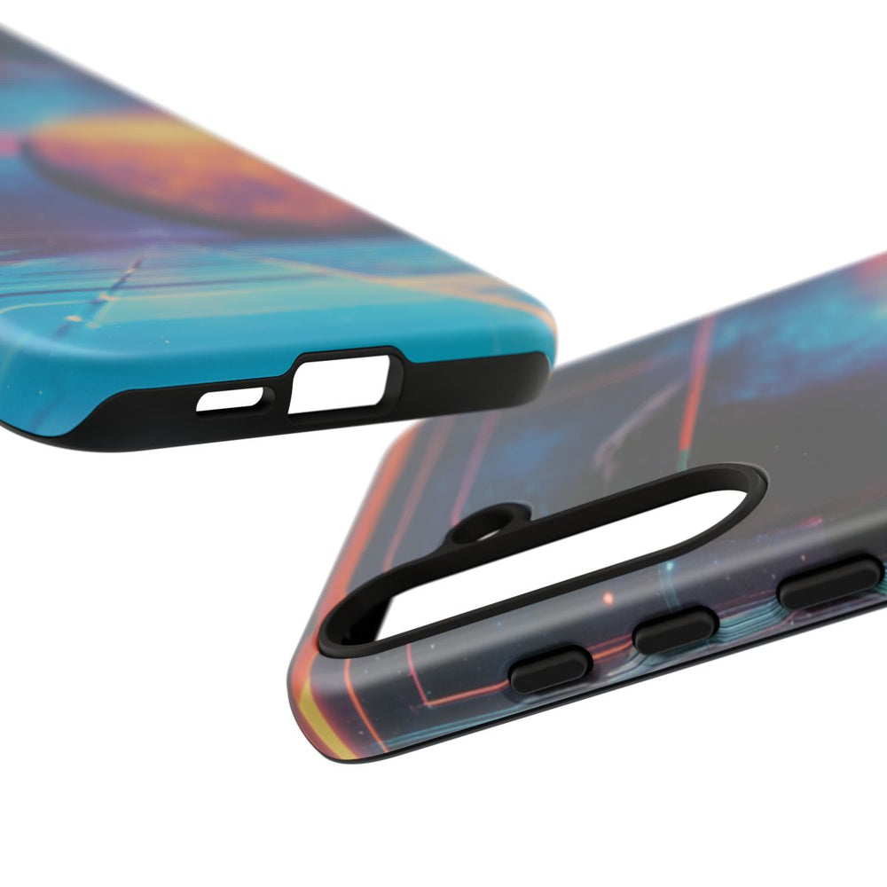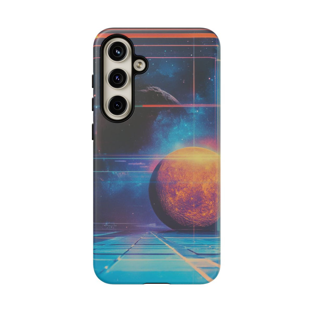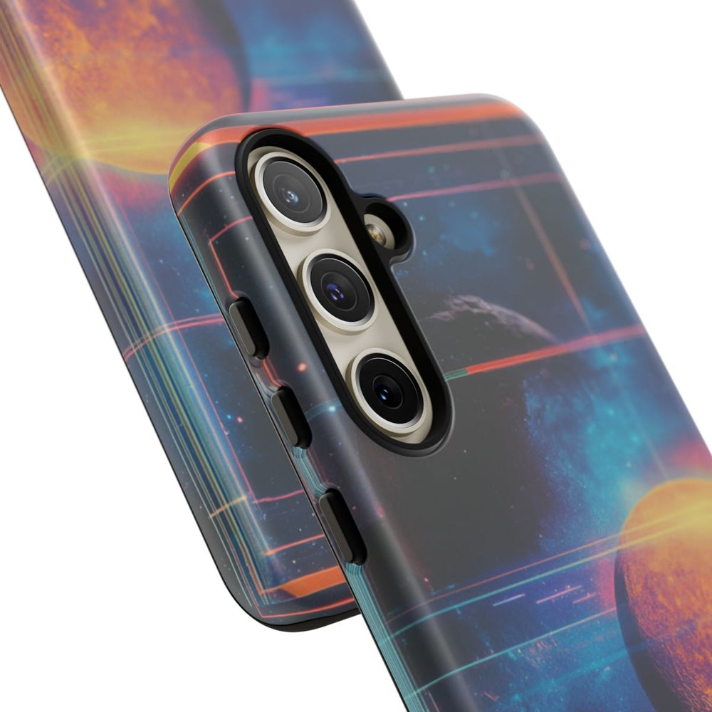 Dit hoesje heeft een abstracte weergave van de ruimte, met geometrische vormen en levendige kleuren. Een opvallende oranje bol staat centraal tegen een donkere achtergrond met blauwe en paarse accenten. Het ontwerp bevat een rasterpatroon en lichtgevende lijnen, wat zorgt voor een futuristische uitstraling. Het hoesje is voorzien van een dubbele laag voor extra bescherming en is geschikt voor draadloos opladen. Ideaal voor liefhebbers van moderne kunst en kosmische thema’s.