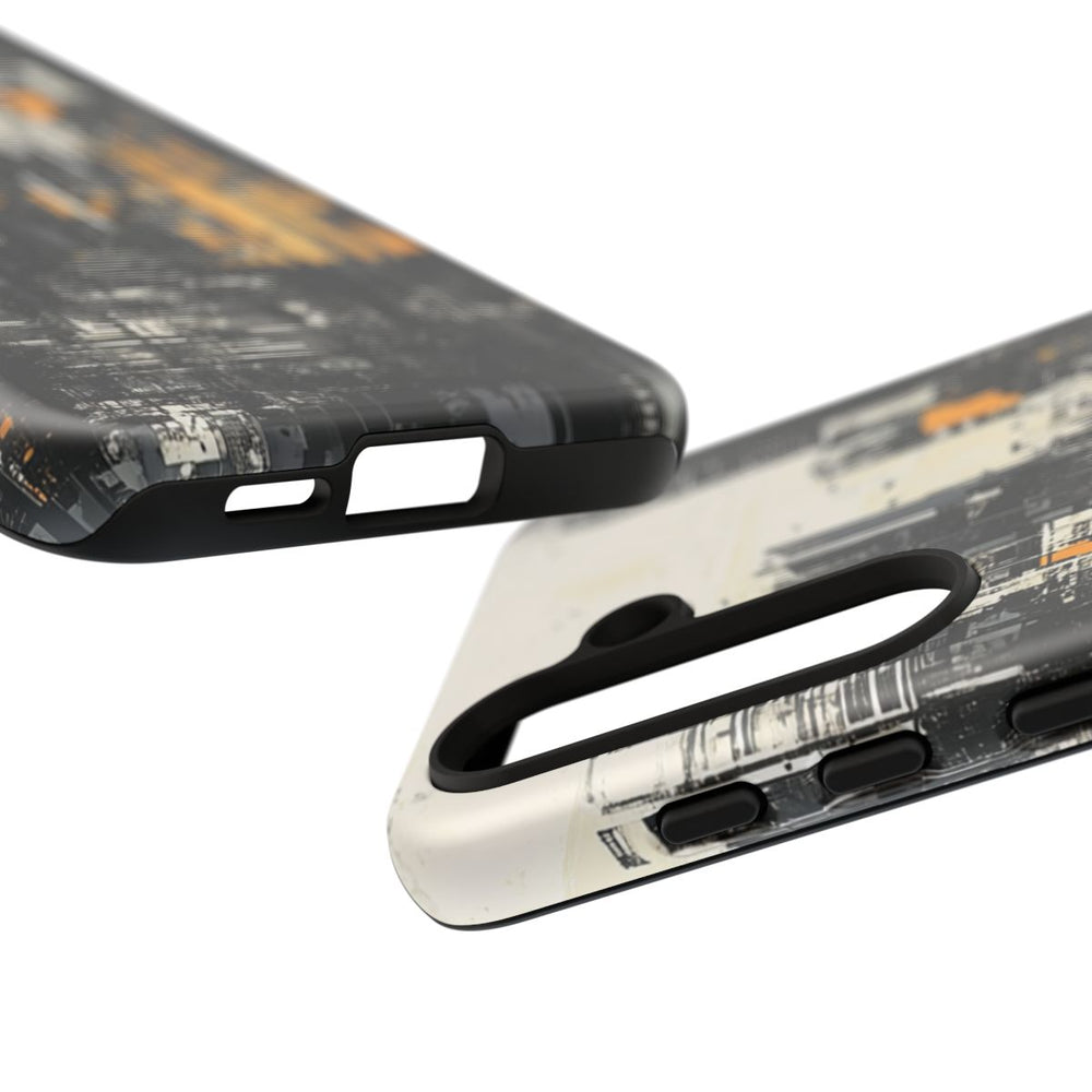 Dit telefoonhoesje is voorzien van een abstract stadsgezicht met hoge gebouwen in een moderne, minimalistische stijl. Het ontwerp gebruikt een beperkt kleurenpalet met vooral zwarte en grijze tinten, aangevuld met warme oranje accenten. De lichte achtergrond zorgt voor een mooi contrast met de donkere gebouwen. Het hoesje bestaat uit twee lagen van polycarbonaat en TPU voor extra bescherming en is geschikt voor draadloos opladen.