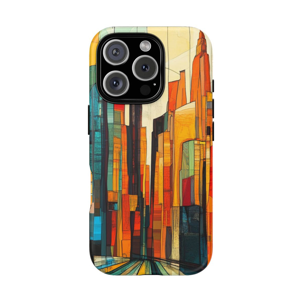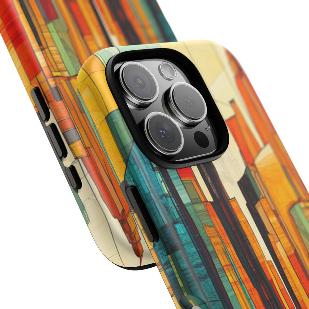 Dit hoesje heeft een abstract ontwerp van een stedelijke skyline met hoge, geometrische gebouwen in opvallende tinten oranje, geel, blauw en groenblauw. Het kunstwerk maakt gebruik van krachtige lijnen en kleurvlakken om een moderne stadsaanblik met diepte en perspectief te creëren. Het hoesje bestaat uit twee lagen met een matte afwerking en is vervaardigd uit polycarbonaat en TPU, wat zorgt voor extra stevigheid en bescherming. Ondersteunt draadloos opladen en is geschikt voor de iPhone 16 Pro.
