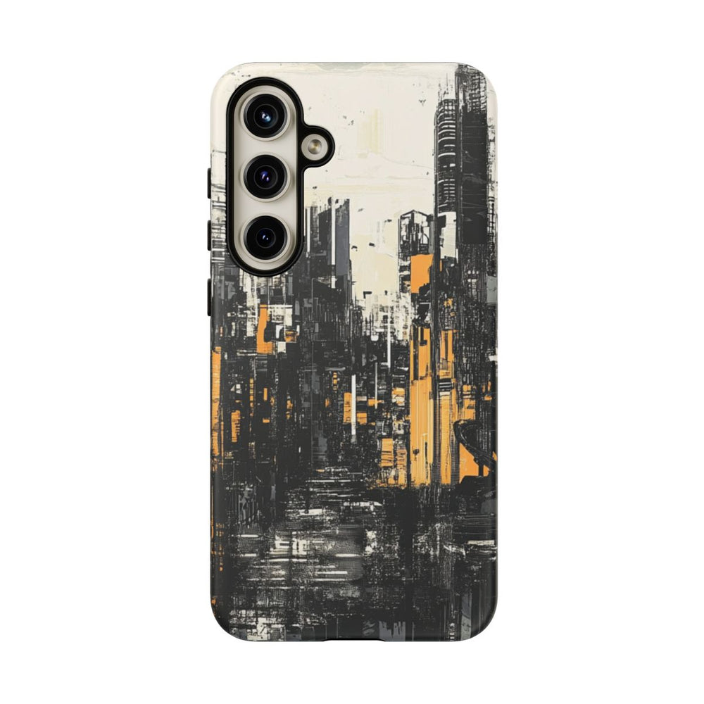 Dit ontwerp toont een abstract stadsgezicht met hoge gebouwen in een eigentijdse, minimalistische stijl. De kleuren bestaan voornamelijk uit zwart- en grijstinten met opvallende oranje accenten. De afbeelding heeft een gelaagde, textuurrijke uitstraling die zorgt voor diepte en karakter. Het hoesje is mat afgewerkt, bestaat uit twee lagen van polycarbonaat en TPU, en is ontworpen voor stevigheid en bescherming tegen weersinvloeden. Geschikt voor draadloos opladen.