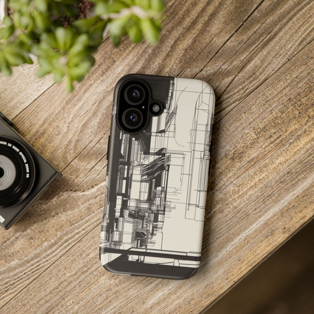 Dit hoesje heeft een abstract stadsgezicht in fijne zwarte lijntekening op een licht beige achtergrond. De afbeelding toont een speels samenspel van geometrische gebouwen en architectonische details, wat zorgt voor een minimalistische en moderne uitstraling. Het hoesje bestaat uit twee lagen: een stevige polycarbonaat buitenkant en een TPU binnenzijde. Dit biedt optimale bescherming en is bestand tegen dagelijks gebruik en buitenomstandigheden. Geschikt voor draadloos opladen.