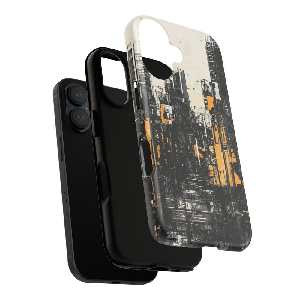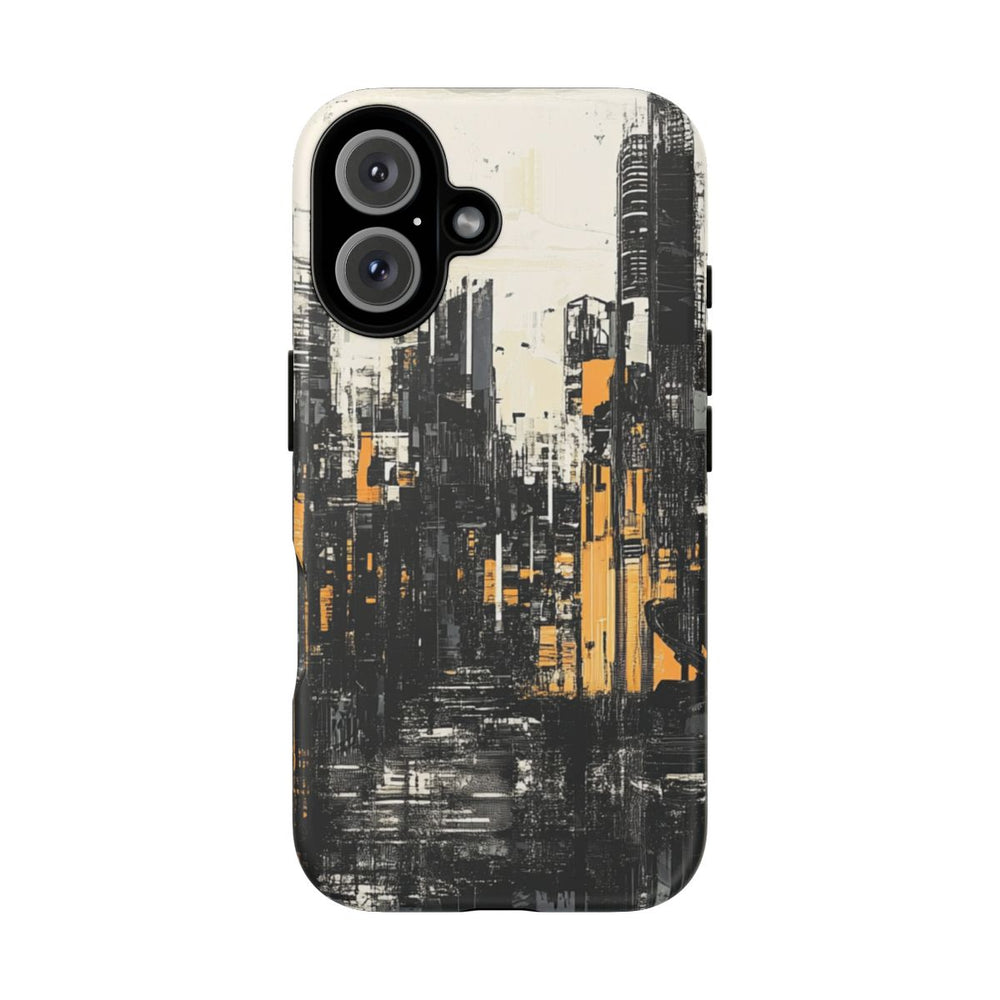 Dit hoesje is voorzien van een abstracte stadsgezicht met hoge gebouwen, uitgevoerd in een minimalistische lijntekening. Het ontwerp gebruikt een beperkt kleurenpalet van zwart, grijs en subtiele oranje accenten op een lichtbeige achtergrond. De afbeelding is rijk aan fijne lijnen en texturen, wat zorgt voor een eigentijdse en unieke uitstraling. Het matte hoesje bestaat uit twee lagen van polycarbonaat en TPU, ondersteunt draadloos opladen en is bestand tegen invloeden van buitenaf.