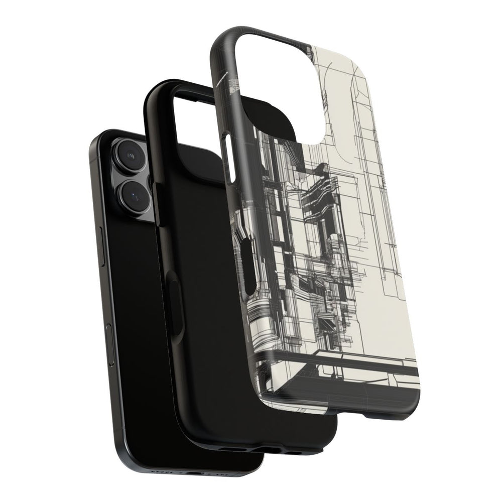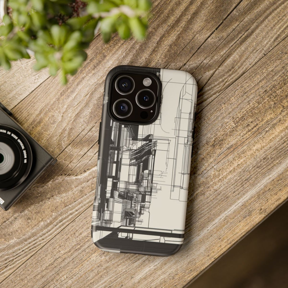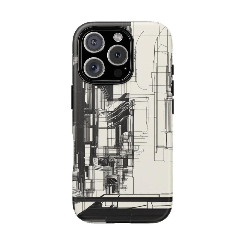 Dit hoesje heeft een abstract stadsgezicht, getekend met fijne zwarte lijnen op een lichte achtergrond. Het ontwerp bestaat uit een speelse compositie van geometrische vormen en architectonische details, wat zorgt voor een minimalistische en moderne uitstraling. Het hoesje is opgebouwd uit twee lagen: een stevige polycarbonaat buitenkant en een TPU-binnenkant voor extra bescherming. Het hoesje is bestand tegen weersinvloeden en ondersteunt draadloos opladen. Niet geschikt voor MagSafe.
