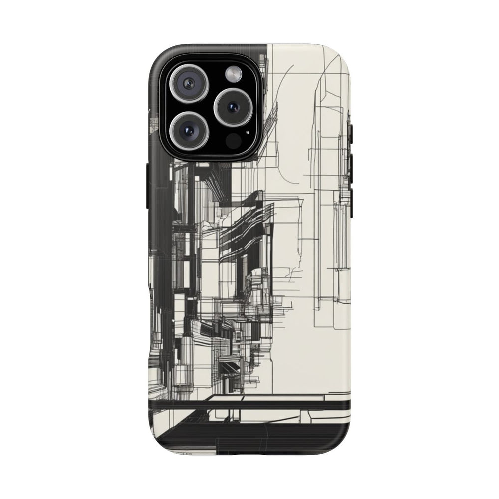 Dit hoesje is voorzien van een abstract stadsgezicht, getekend met fijne zwarte lijnen op een lichtbeige achtergrond. Het gedetailleerde lijnenspel toont een complexe compositie van gebouwen en architectonische elementen in een minimalistische stijl. Het stevige, matte hoesje bestaat uit twee lagen: een polycarbonaat buitenkant en een TPU-binnenzijde voor extra stevigheid en bescherming. Het hoesje ondersteunt draadloos opladen en is bestand tegen weersinvloeden.