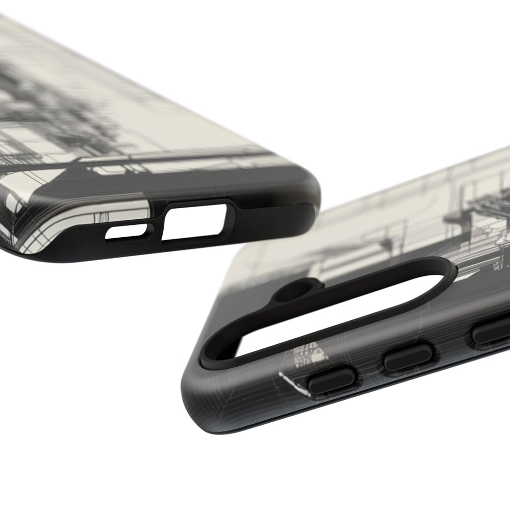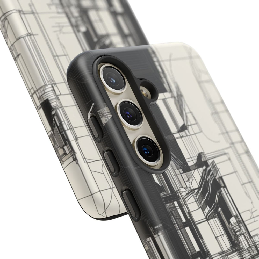 Dit hoesje heeft een abstract stadsgezicht, gevormd door fijne zwarte lijnen op een lichte achtergrond. Het ontwerp bestaat uit een speelse combinatie van geometrische vormen en architectonische details, wat zorgt voor een minimalistische en moderne uitstraling. Het stevige hoesje bestaat uit twee lagen: een matte polycarbonaat buitenkant en een TPU binnenzijde voor extra bescherming en duurzaamheid. Geschikt voor draadloos opladen en bestand tegen weersinvloeden.