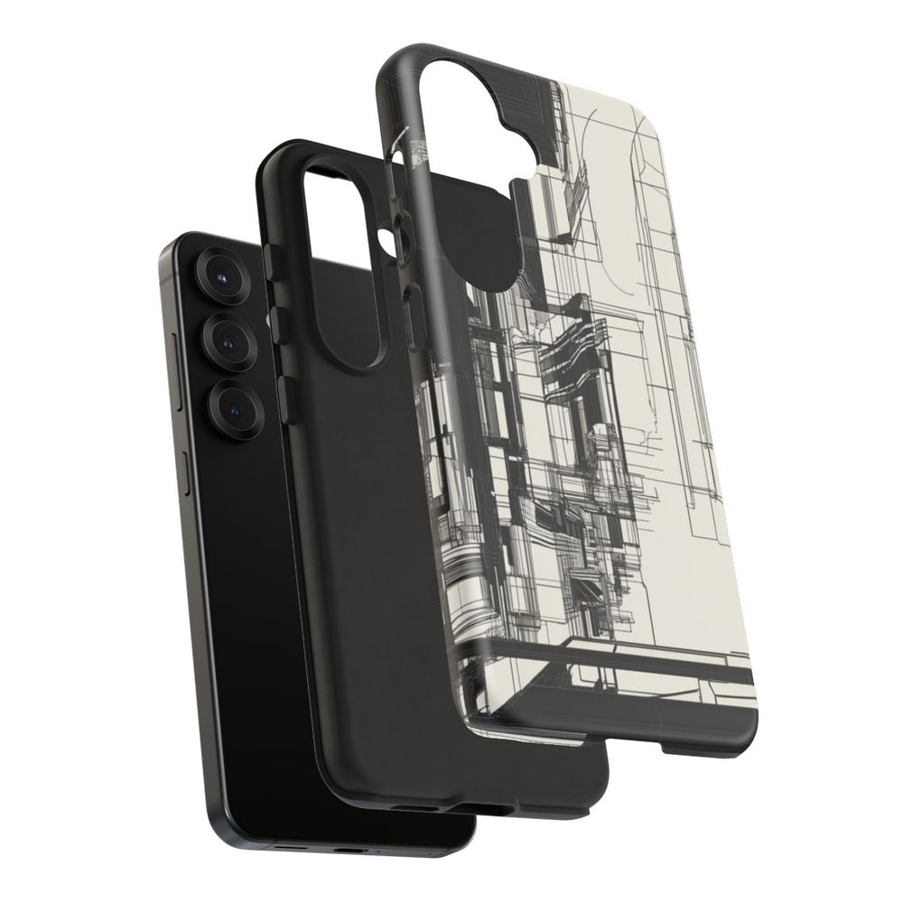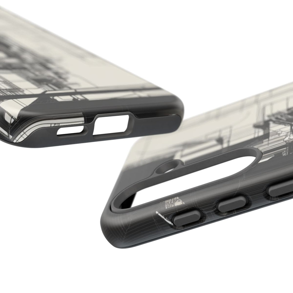 Dit hoesje heeft een abstract stadsgezicht dat is opgebouwd uit fijne zwarte lijnen op een lichte achtergrond. Het gedetailleerde lijnenspel vormt een minimalistisch en modern architectonisch patroon. Het stevige hoesje bestaat uit twee lagen: een matte polycarbonaat buitenkant en een TPU-binnenkant, waardoor het extra duurzaam is en goed bestand tegen gebruik buitenshuis. Ondersteunt draadloos opladen en blijft langdurig mooi van kleur en uitstraling.