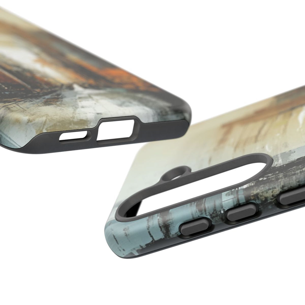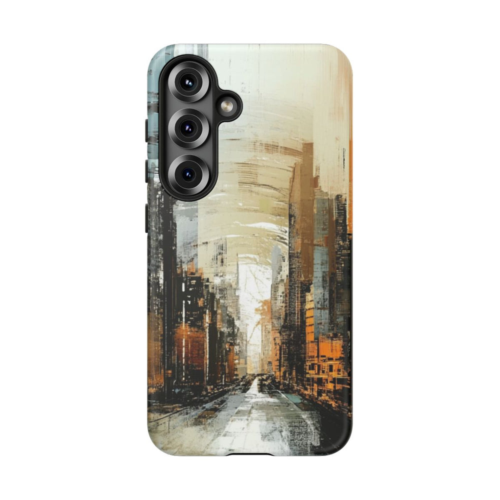 Dit hoesje heeft een abstract ontwerp van een stedelijke skyline, met hoge gebouwen langs een centrale straat die uitkomt op een heldere, lichte horizon. Het kunstwerk is uitgevoerd in gedempte kleuren zoals zwart, grijs, beige en oranje, met getextureerde penseelstreken voor een eigentijdse en minimalistische uitstraling. Het matte, stevige hoesje bestaat uit twee lagen van polycarbonaat en TPU voor extra bescherming en ondersteunt draadloos opladen.
