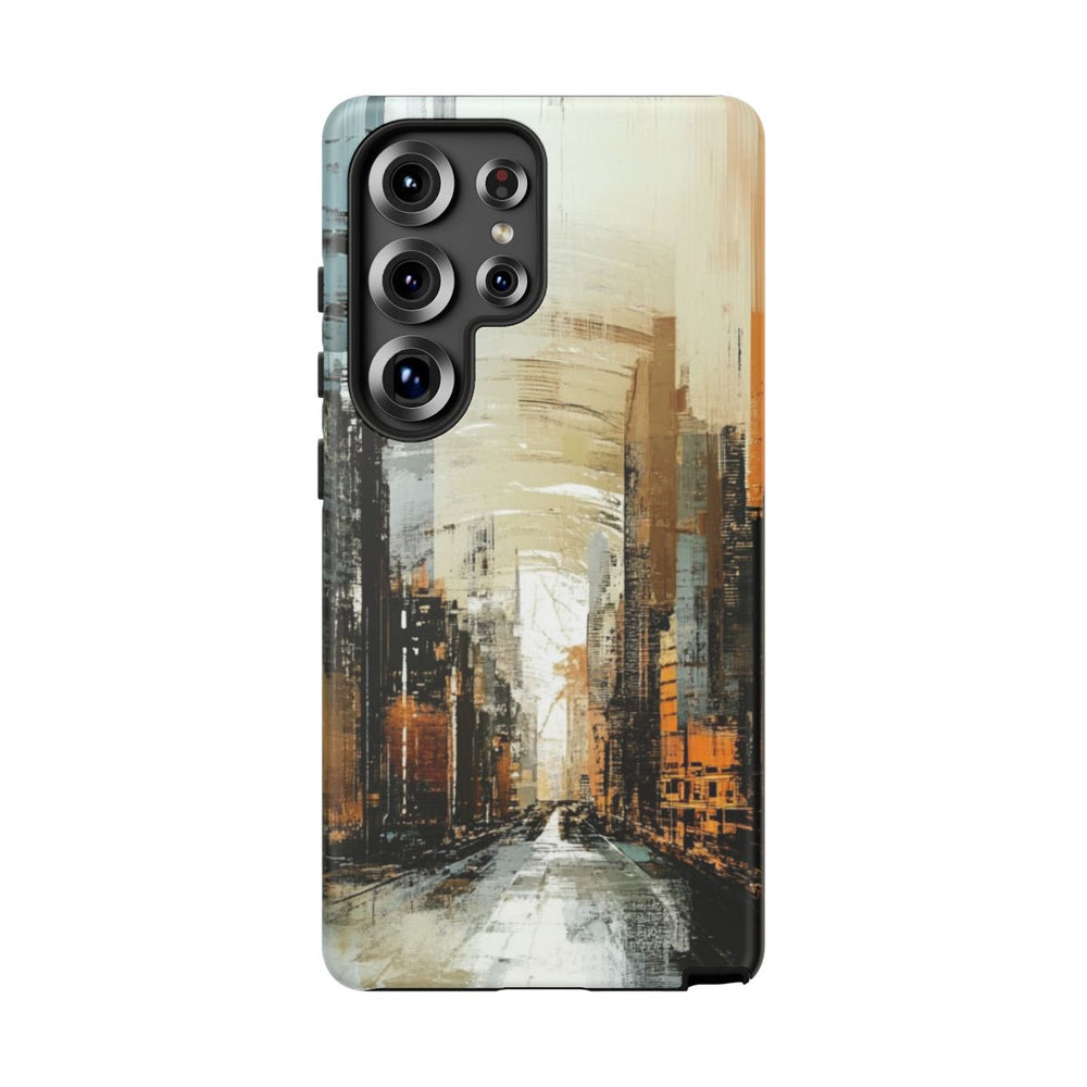 Dit hoesje heeft een abstract ontwerp van een stedelijke skyline met hoge gebouwen langs een centrale straat. Het kunstwerk combineert gedempte kleuren zoals zwart, grijs, beige en oranje en zorgt zo voor een gelaagd en textuurrijk effect. De afbeelding is eigentijds en minimalistisch, met verticale penseelstreken en een gevoel van diepte. Het hoesje is gemaakt van polycarbonaat met een TPU-voering en biedt dubbele bescherming. Daarnaast ondersteunt het draadloos opladen.