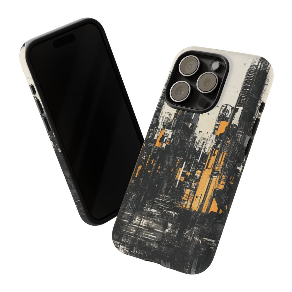 Dit hoesje is voorzien van een abstract stadsgezicht met hoge gebouwen in een moderne, minimalistische stijl. Het ontwerp gebruikt voornamelijk zwarte en grijze tinten, met accenten van oranje en beige voor een opvallend contrast. De afbeelding is gedrukt op een mat hoesje met een stevige buitenkant van polycarbonaat en een TPU-binnenzijde, wat zorgt voor dubbele bescherming. Het hoesje ondersteunt draadloos opladen en is ontworpen voor langdurig gebruik en bestand tegen invloeden van buitenaf.