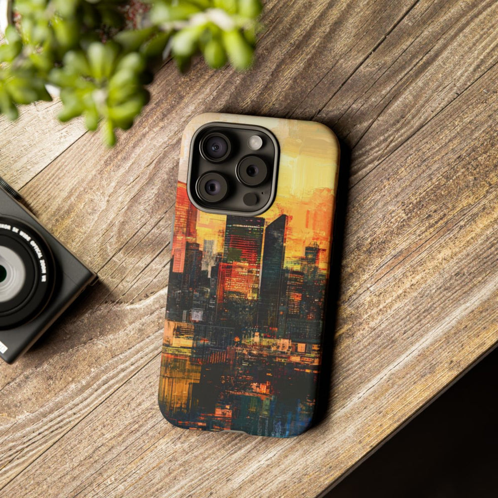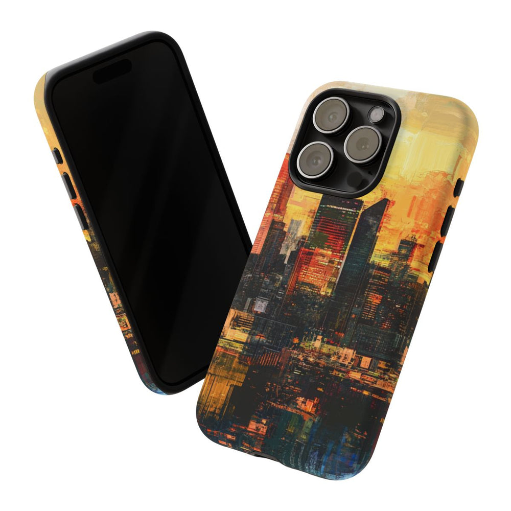 Dit hoesje heeft een abstracte afbeelding van een stadsgezicht bij zonsondergang, met hoge gebouwen in een schilderachtige, getextureerde stijl. Warme tinten oranje, geel en rood vullen de lucht en lopen over in donkere kleuren zoals zwart en diepblauw in de stad en de weerspiegeling daaronder. Het ontwerp oogt modern en artistiek, met zichtbare penseelstreken en gelaagde kleuren. Het hoesje bestaat uit twee lagen, met een matte afwerking, een polycarbonaat buitenkant en een TPU-binnenzijde. Geschikt voor draadloos opladen.