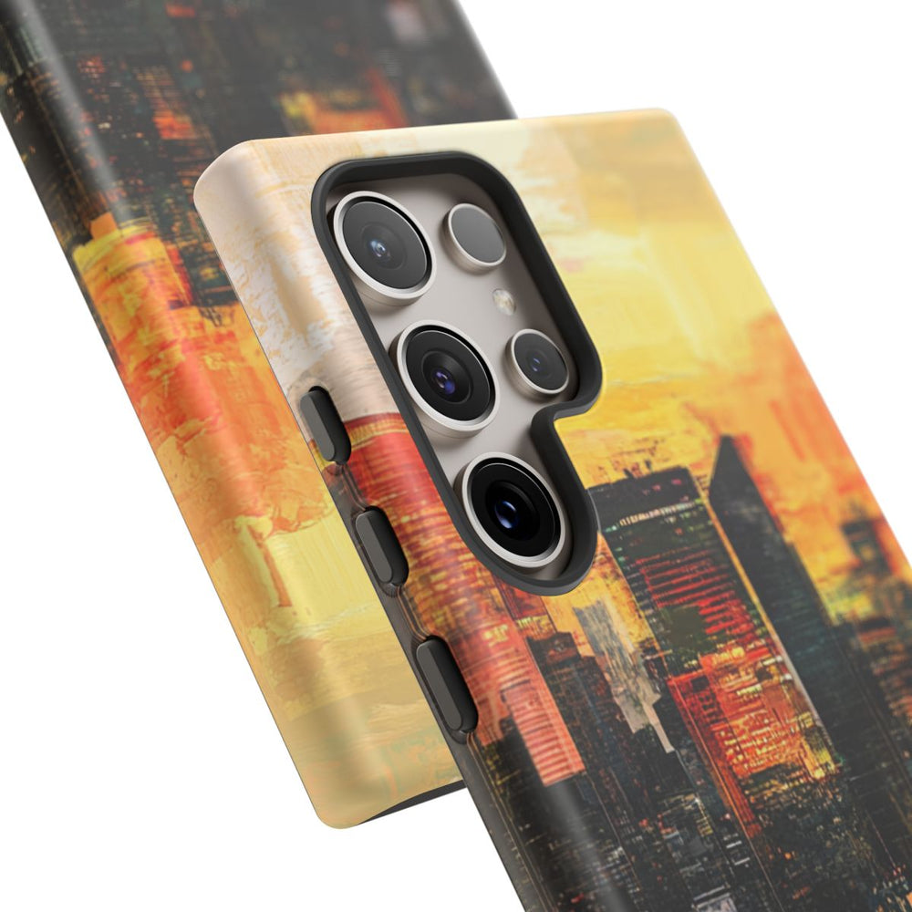 Dit hoesje toont een abstracte stadsgezicht bij zonsondergang, met hoge gebouwen in donkere tinten die afsteken tegen een levendige lucht vol gele, oranje en rode kleuren. Het ontwerp heeft een geschilderde uitstraling met zichtbare penseelstreken en gelaagde kleuren. Het hoesje bestaat uit twee stevige lagen van polycarbonaat en TPU, wat zorgt voor extra bescherming en geschikt is voor draadloos opladen. De uitstraling is modern en artistiek.
