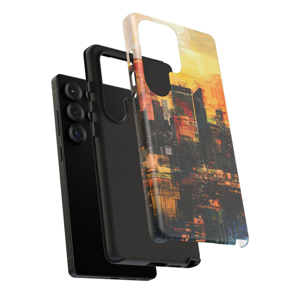 Dit hoesje heeft een abstract stadsgezicht met hoge gebouwen in een schilderachtige stijl. De skyline wordt omlijst door een levendige zonsondergang met warme tinten geel, oranje en rood, die subtiel overlopen in zachte perzik- en beigetinten. In het onderste deel van het ontwerp zorgen reflecties en donkere tinten zwart en blauw voor extra diepte. Het hoesje bestaat uit twee lagen: een stevige buitenkant van polycarbonaat en een schokabsorberende TPU-binnenzijde. Geschikt voor draadloos opladen en bestand tegen verschillende weersomstandigheden.
