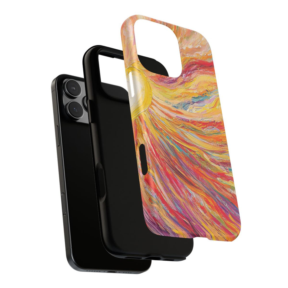 Dit hoesje heeft een abstract ontwerp van een zonnestraal, waarbij dikke, getextureerde penseelstreken vanuit het midden naar buiten lopen. De centrale zon is helder geel met wit en wordt omringd door wervelende streken in warme tinten rood, oranje, roze en geel, met accenten van blauw en paars. Het geheel oogt levendig en dynamisch. De afbeelding is gedrukt op een matte, stevige hoes met dubbele laag van polycarbonaat en TPU. Dit hoesje ondersteunt draadloos opladen en is speciaal ontworpen voor een specifiek telefoonmodel.