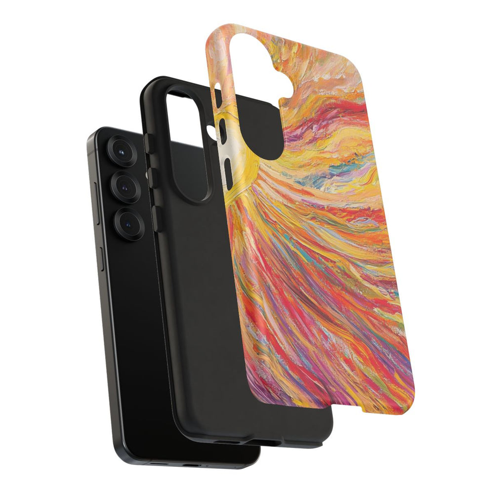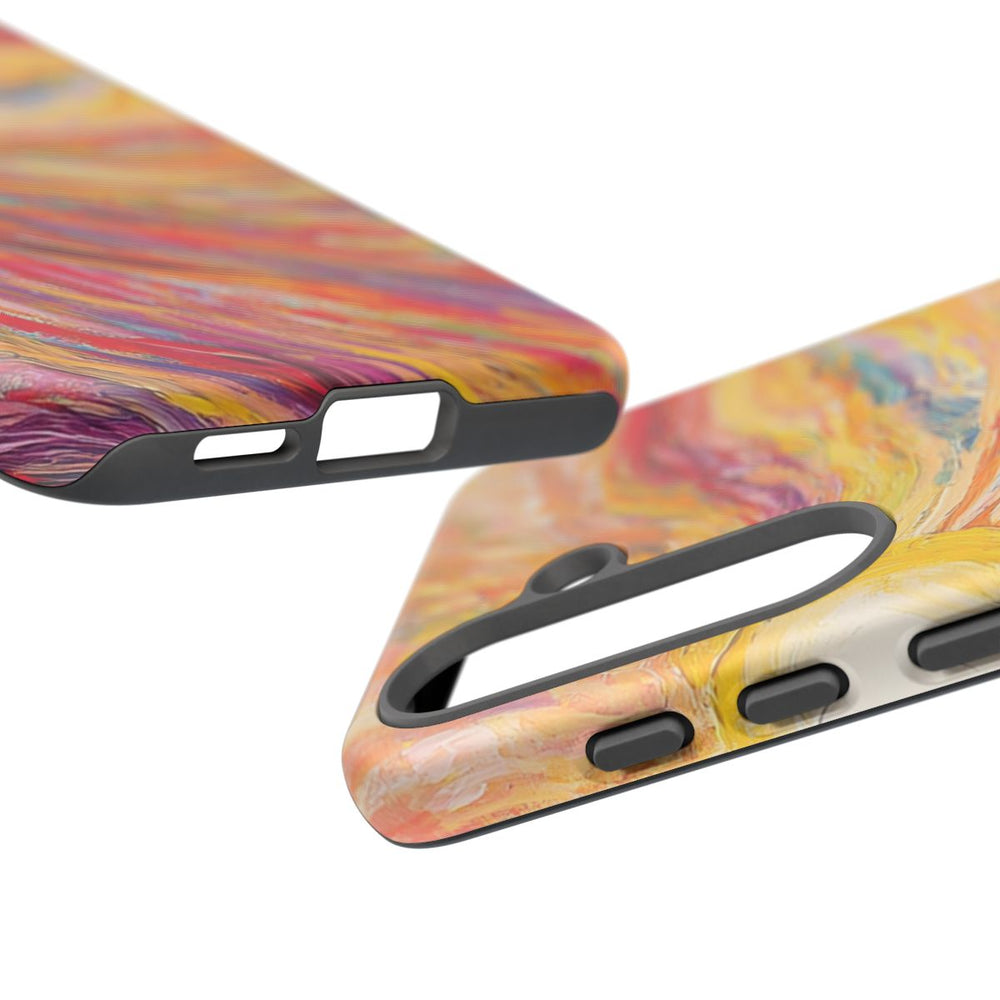 Dit ontwerp toont een levendige abstracte zonnestraal met dikke, voelbare penseelstreken die vanuit een helder, lichtgevend middelpunt naar buiten waaieren. De draaiende lijnen bestaan uit warme kleuren zoals geel, oranje, rood en roze, aangevuld met koelere tinten als blauw en paars. De afbeelding is gedrukt op een matte, stevige hoes met dubbele laag van polycarbonaat en TPU, die extra bescherming biedt en geschikt is voor draadloos opladen. Dit hoesje is speciaal ontworpen voor de Galaxy S25.