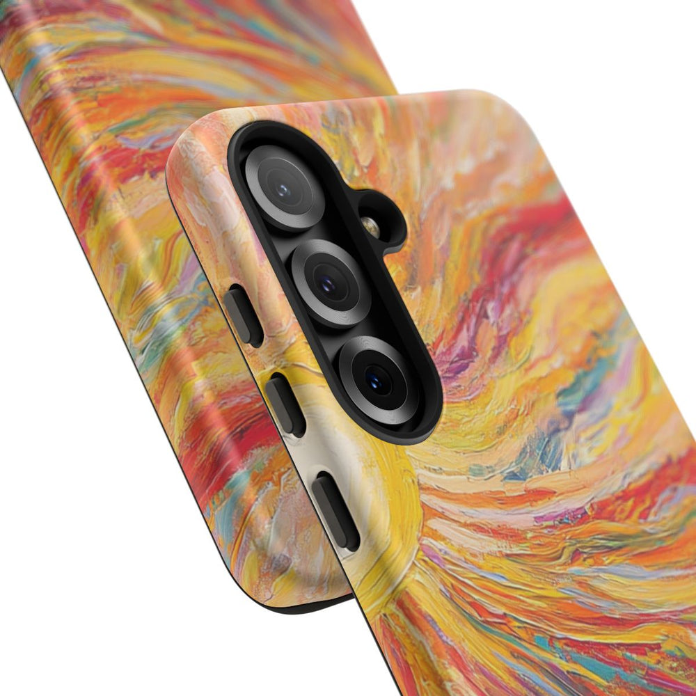 Dit hoesje heeft een abstract ontwerp van zonnestralen die met dikke, voelbare penseelstreken vanuit een heldere, centrale cirkel naar buiten lopen. De kleuren zijn levendig en bestaan uit geel, oranje, rood, roze, paars en accenten van blauw en groen, wat zorgt voor een dynamische en energieke uitstraling. Het hoesje bestaat uit twee lagen: een stevige polycarbonaat buitenkant en een TPU-binnenzijde voor extra bescherming. Ondersteunt draadloos opladen. Het kunstwerk straalt warmte en beweging uit.