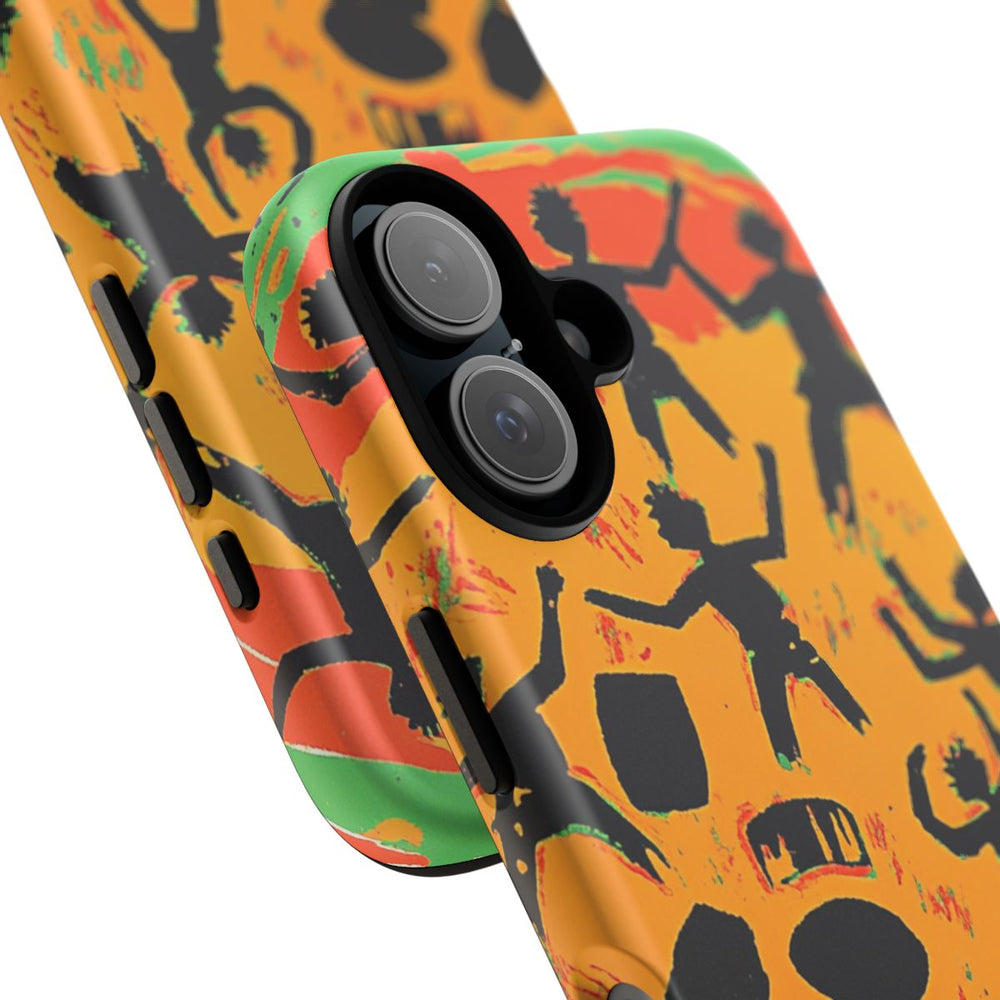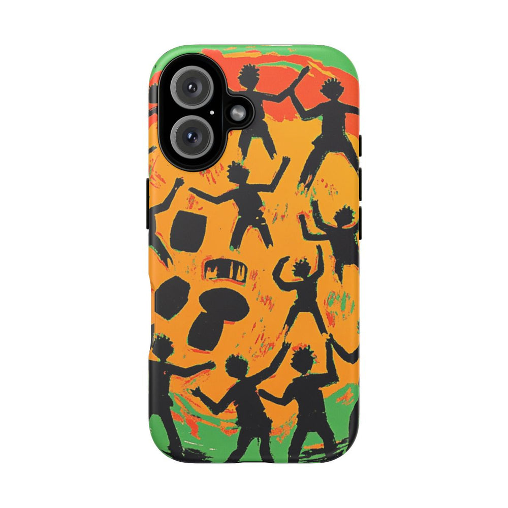 Dit hoesje is voorzien van een levendig abstract ontwerp met zwarte silhouetten van dansende mensen en trommelaars in een cirkel. Op de achtergrond zorgen krachtige penseelstreken in oranje, groen en rood voor een energieke en dynamische uitstraling. Het ontwerp is gedrukt op een mat hoesje van polycarbonaat en TPU, dat bestaat uit twee lagen voor optimale bescherming en geschikt is voor draadloos opladen. De stijl is minimalistisch en geïnspireerd op tribale kunst.