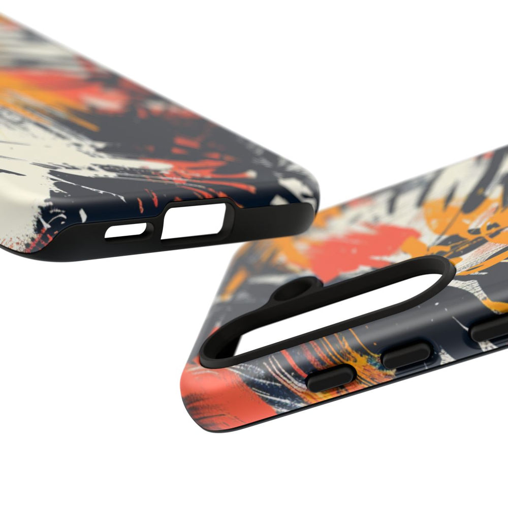 Dit hoesje heeft een abstract patroon met opvallende penseelstreken en palmbladvormen in levendige oranje, gele, zwarte en witte tinten. De overlappende elementen zorgen voor een dynamische en energieke uitstraling met een tropische sfeer. Het patroon is gedrukt op een mat hoesje van polycarbonaat en TPU, dat bestaat uit twee lagen voor extra bescherming en geschikt is voor draadloos opladen. Het hoesje is ontworpen voor duurzaamheid en biedt goede weerstand tegen invloeden van buitenaf, terwijl de optische helderheid behouden blijft.