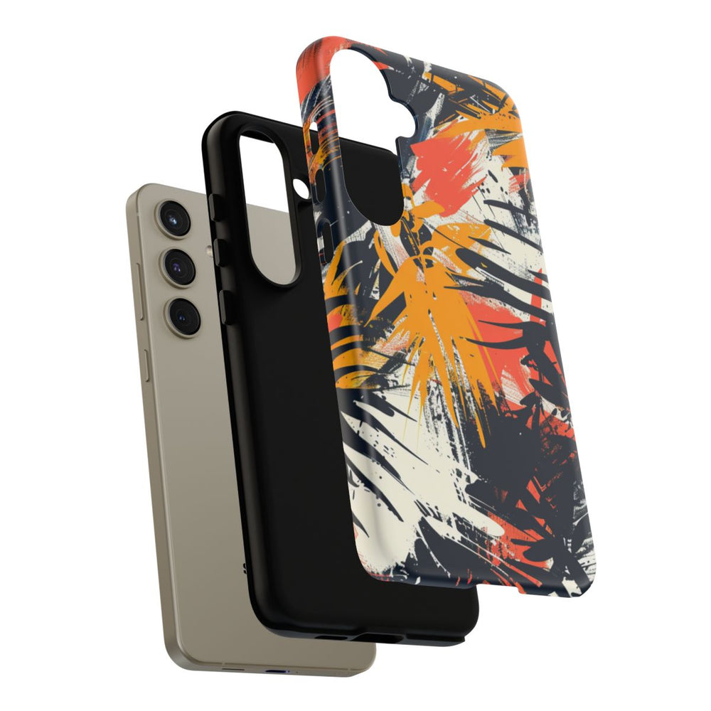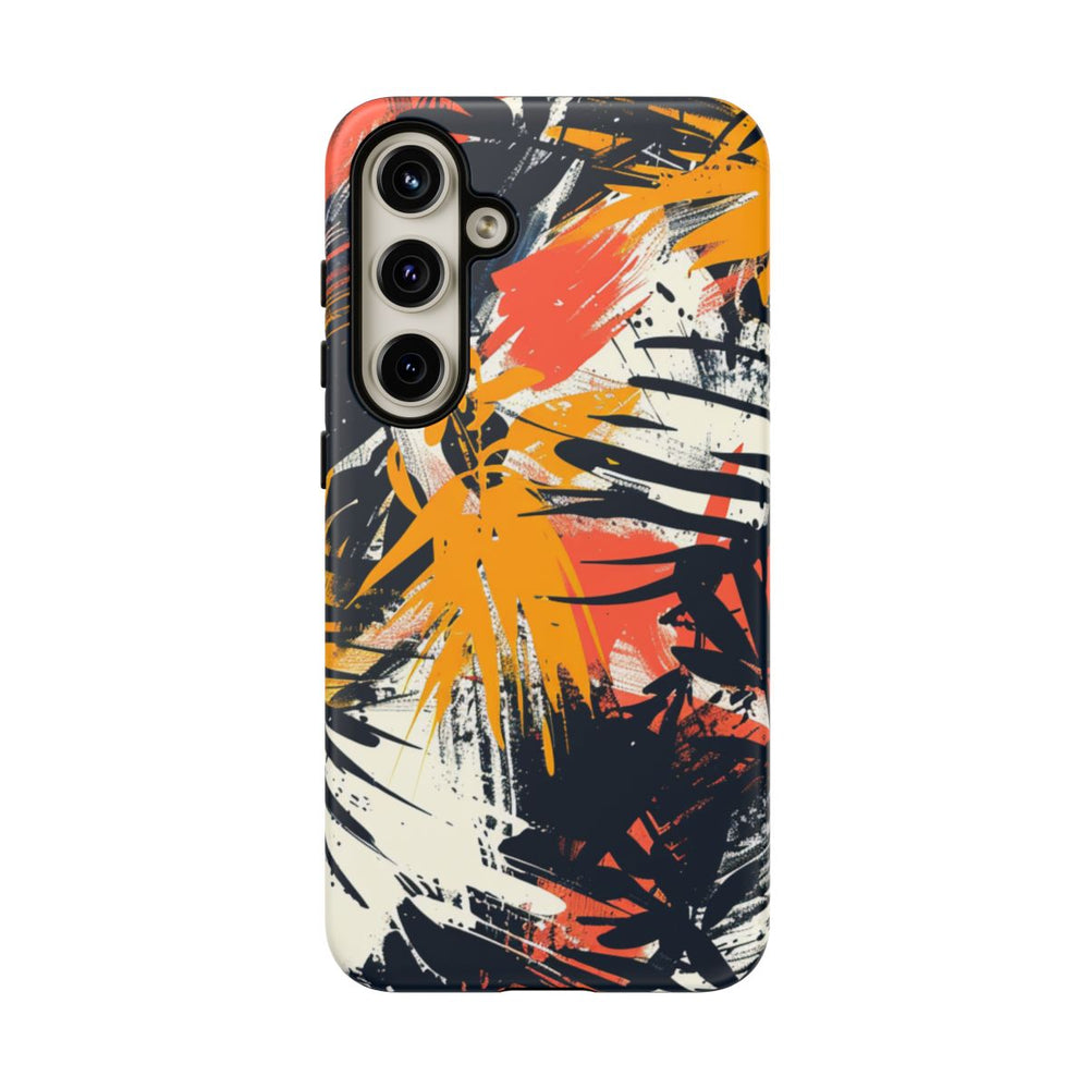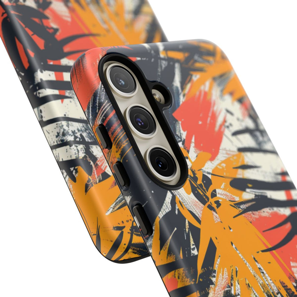 Dit hoesje heeft een abstract patroon met opvallende penseelstreken en palmbladvormen in levendige oranje, gele, zwarte en witte tinten. De overlappende elementen zorgen voor een dynamische en energieke uitstraling met een tropische sfeer. Het patroon is gedrukt op een mat hoesje van polycarbonaat en TPU, dat bestaat uit twee lagen voor extra bescherming en geschikt is voor draadloos opladen. Het hoesje is ontworpen voor duurzaamheid en biedt goede weerstand tegen invloeden van buitenaf, terwijl de optische helderheid behouden blijft.