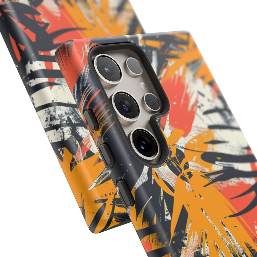 Dit hoesje heeft een abstract patroon met opvallende penseelstreken en palmbladvormen in levendige oranje, gele, zwarte en witte tinten. De overlappende elementen zorgen voor een dynamische en energieke uitstraling met een tropische sfeer. Het patroon is gedrukt op een mat hoesje van polycarbonaat en TPU, dat bestaat uit twee lagen voor extra bescherming en geschikt is voor draadloos opladen. Het hoesje is ontworpen voor duurzaamheid en biedt goede weerstand tegen invloeden van buitenaf, terwijl de optische helderheid behouden blijft.