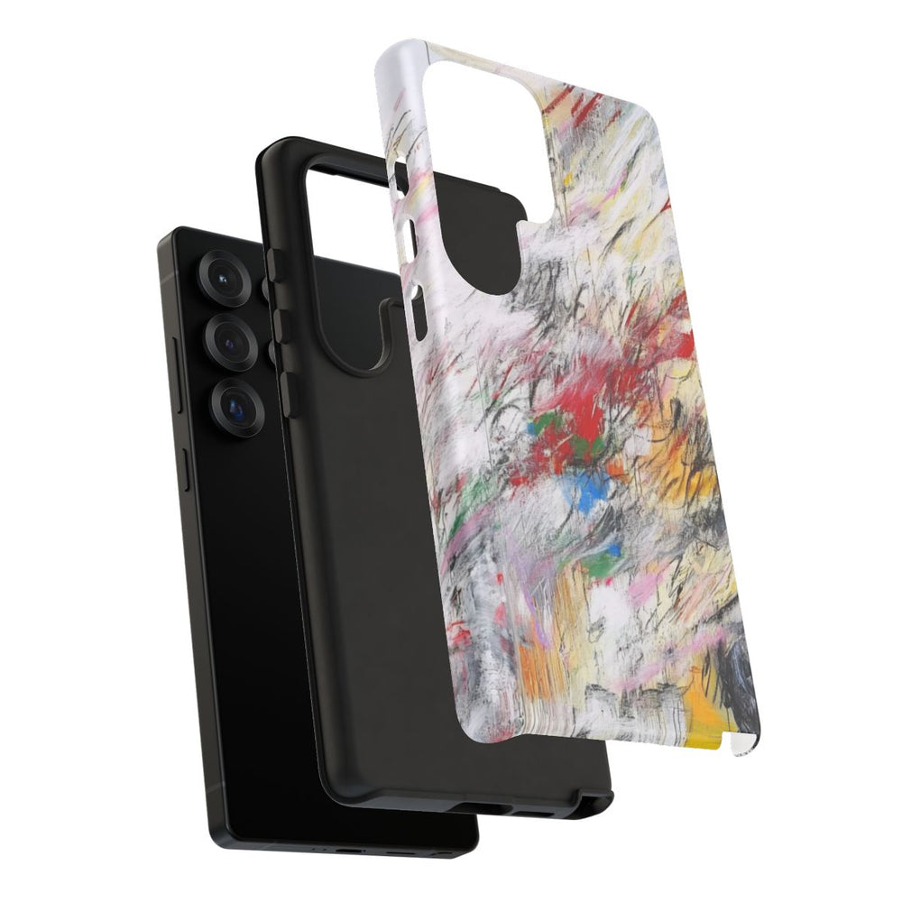 Dit telefoonhoesje heeft een abstract ontwerp met dynamische penseelstreken en vegen in diverse kleuren, zoals rood, geel, zwart, grijs, roze, groen, blauw en oranje op een overwegend witte achtergrond. Het beeld heeft een gelaagde, getextureerde uitstraling met een mix van scherpe en vervaagde lijnen, wat zorgt voor een levendige en energieke uitstraling. Het hoesje bestaat uit een stevige polycarbonaat buitenkant en een TPU-binnenlaag, waardoor je toestel optimaal beschermd is. Ondersteunt draadloos opladen.