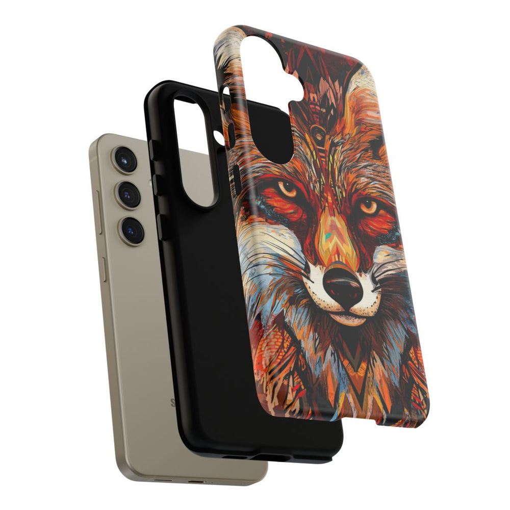 Dit telefoonhoesje is voorzien van een gedetailleerde, abstracte illustratie van het gezicht van een vos, uitgevoerd in levendige kleuren zoals oranje, rood, zwart, wit en blauw. De intense blik van de vos en de verfijnde vachtaccenten zorgen voor een opvallende en kunstzinnige uitstraling. De achtergrond bevat abstracte patronen in warme tinten die mooi aansluiten bij het ontwerp. Het stevige hoesje heeft een dubbele laag van polycarbonaat en TPU, waardoor het extra bescherming biedt en geschikt is voor draadloos opladen.