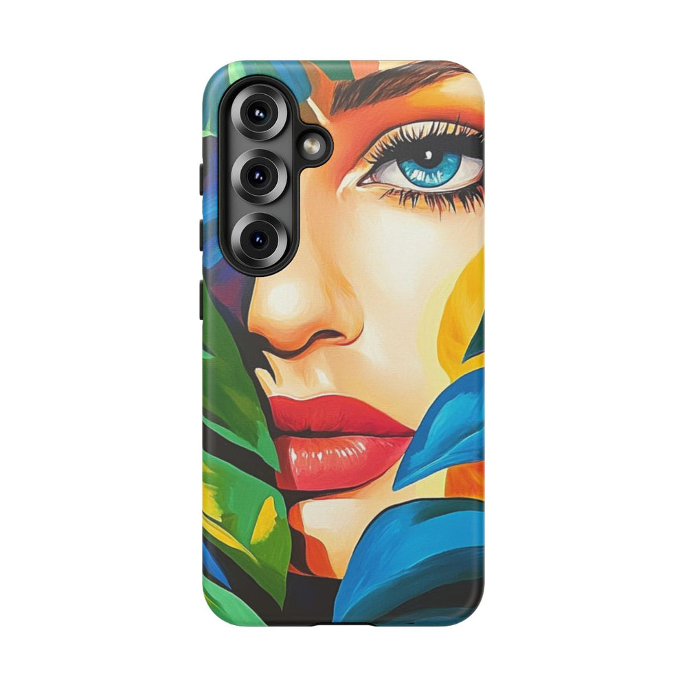 Geef je toestel een artistieke en beschermende uitstraling met dit opvallende matte hoesje. Het ontwerp toont een abstract schilderij van een vrouwenportret dat tussen weelderige monstera bladeren tevoorschijn komt, uitgevoerd in levendige kleuren en met oog voor detail. Dankzij de combinatie van 100% polycarbonaat en TPU biedt het hoesje stevige bescherming en is het geschikt voor draadloos opladen. Voeg een uniek en stijlvol accessoire toe aan je telefoon en combineer creativiteit met praktische bescherming.