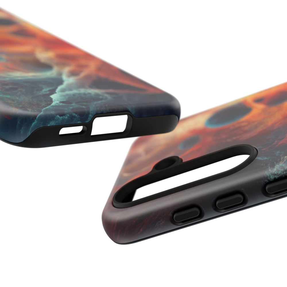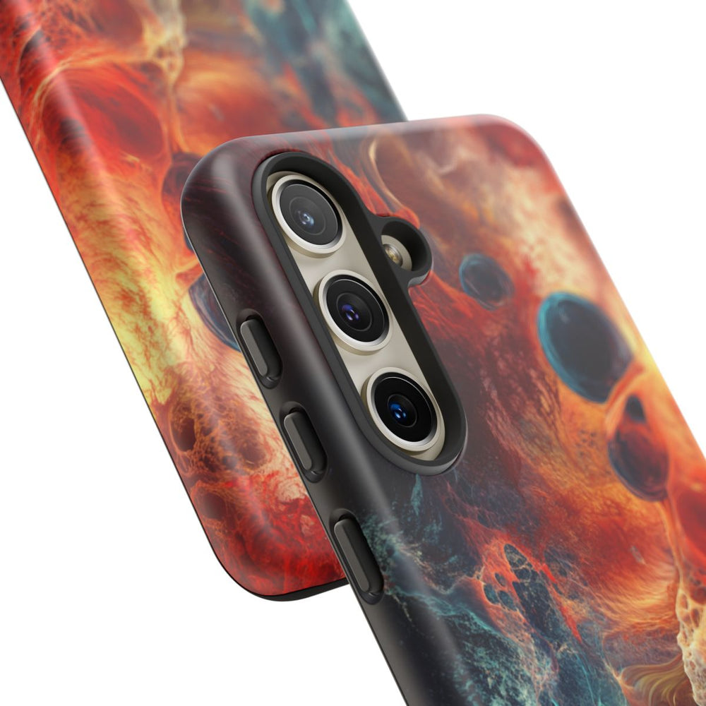 Dit hoesje heeft een abstract ontwerp waarin vurige rode en oranje tinten subtiel overlopen in koele blauwe en turquoise kleuren. Het patroon bestaat uit verfijnde, webachtige lijnen en bolvormige elementen die samen zorgen voor een dynamisch en vloeiend effect. Het spel tussen warme en koele kleuren geeft het ontwerp extra diepte en karakter. Het stevige hoesje bestaat uit twee lagen: een matte buitenkant van polycarbonaat en een zachte TPU-binnenkant. Het hoesje ondersteunt draadloos opladen en is bestand tegen verschillende weersomstandigheden.