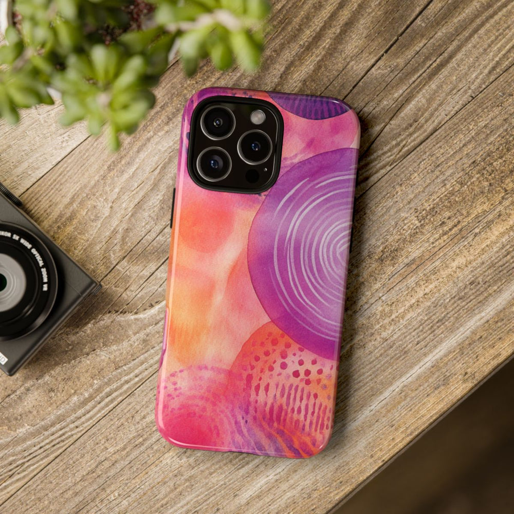 Dit telefoonhoesje is voorzien van een abstract patroon met waterverf, bestaande uit diverse cirkelvormen in warme tinten roze, paars en oranje. De cirkels hebben verschillende structuren, zoals spiralen, stippen en strepen, wat zorgt voor een speelse en artistieke uitstraling. De achtergrond loopt zacht over in deze kleuren en versterkt het vrolijke en natuurlijke karakter van het ontwerp. Het patroon is gedrukt op een glanzend, stevig hoesje van polycarbonaat en TPU, dat bestaat uit twee lagen voor optimale bescherming en geschikt is voor draadloos opladen.