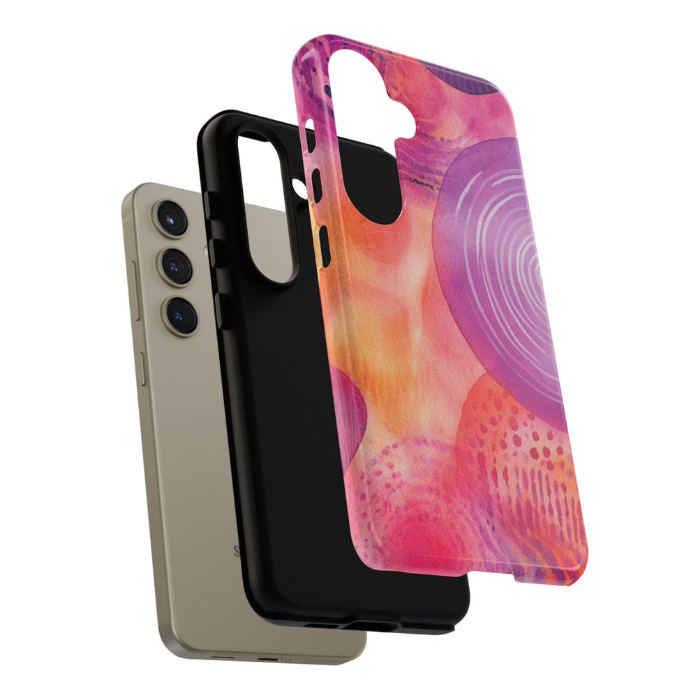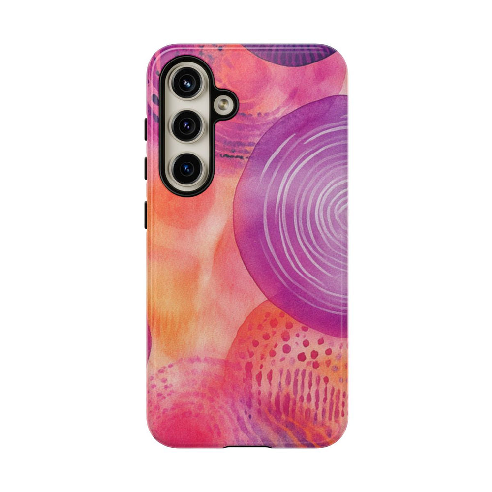 Dit telefoonhoesje is voorzien van een abstract patroon met waterverf, bestaande uit diverse cirkelvormen in warme tinten roze, paars en oranje. De cirkels hebben verschillende structuren, zoals spiralen, stippen en strepen, wat zorgt voor een speelse en artistieke uitstraling. De achtergrond loopt zacht over in deze kleuren en versterkt het vrolijke en natuurlijke karakter van het ontwerp. Het patroon is gedrukt op een glanzend, stevig hoesje van polycarbonaat en TPU, dat bestaat uit twee lagen voor optimale bescherming en geschikt is voor draadloos opladen.