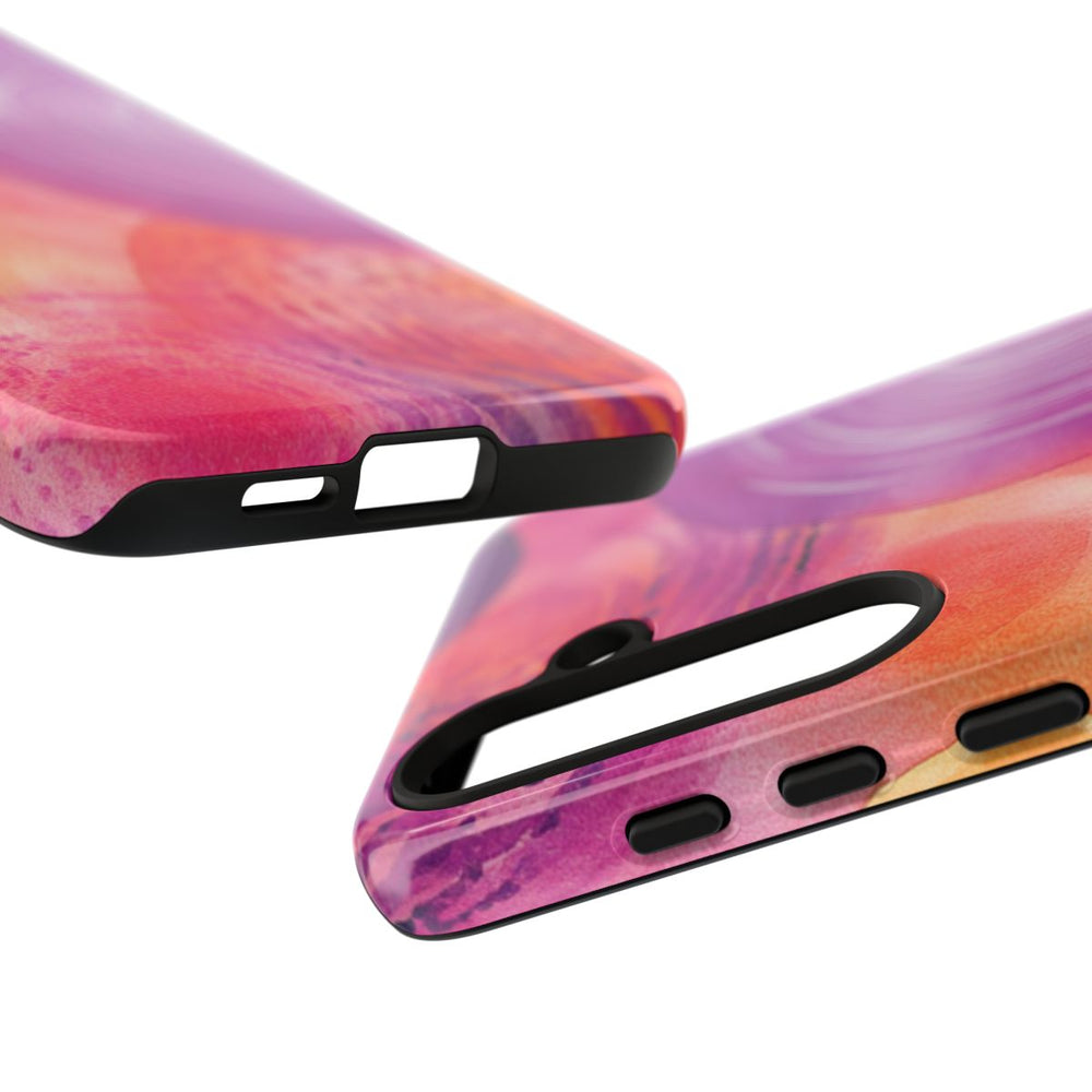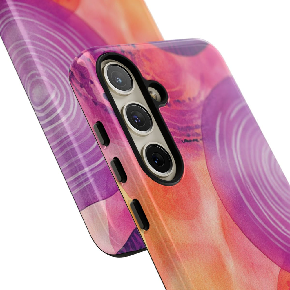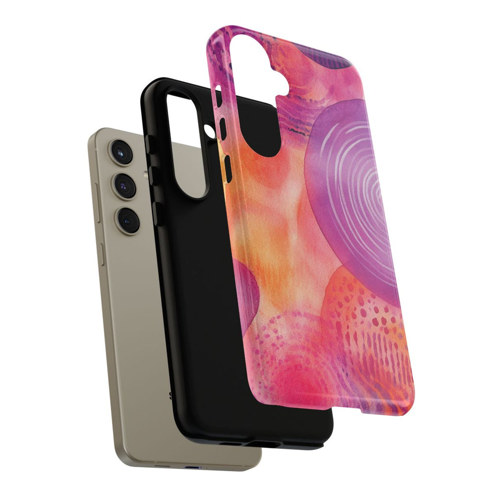 Dit telefoonhoesje is voorzien van een abstract patroon met waterverf, bestaande uit diverse cirkelvormen in warme tinten roze, paars en oranje. De cirkels hebben verschillende structuren, zoals spiralen, stippen en strepen, wat zorgt voor een speelse en artistieke uitstraling. De achtergrond loopt zacht over in deze kleuren en versterkt het vrolijke en natuurlijke karakter van het ontwerp. Het patroon is gedrukt op een glanzend, stevig hoesje van polycarbonaat en TPU, dat bestaat uit twee lagen voor optimale bescherming en geschikt is voor draadloos opladen.