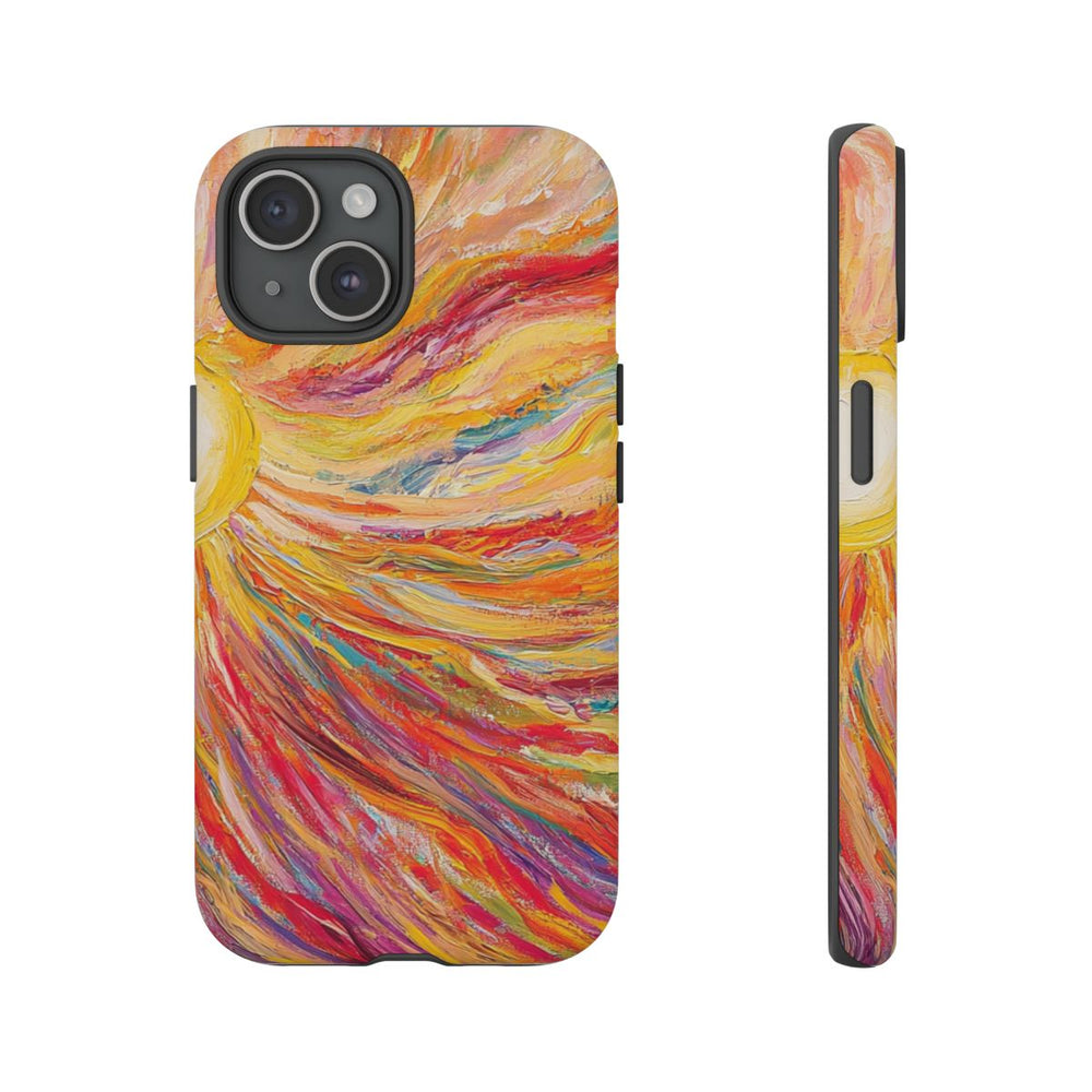 Dit hoesje is voorzien van een levendig abstract schilderij met een stralende zon in het midden, omringd door dynamische penseelstreken in warme kleuren. De draaiende lijnen lopen uit in tinten geel, oranje, rood, roze en accenten van blauw en paars, wat zorgt voor een energiek en levendig geheel. Het hoesje bestaat uit twee lagen met een stevige polycarbonaat buitenkant en een TPU binnenzijde voor extra bescherming. Geschikt voor draadloos opladen.