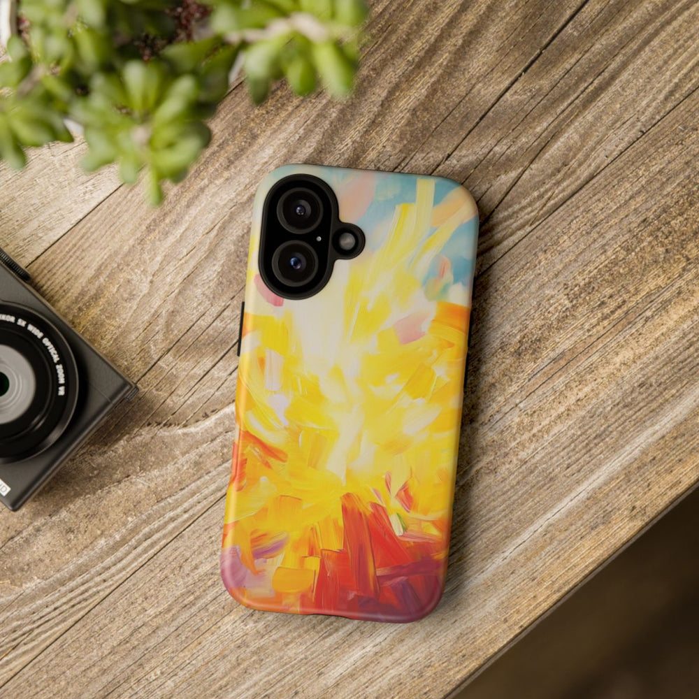 Dit hoesje is versierd met levendige penseelstreken in helder geel, oranje, rood en accenten van groen en blauw, die samen een abstracte indruk van zonneschijn geven. De kleuren vloeien dynamisch in elkaar over en de zichtbare textuur van de penseelstreken zorgt voor een energieke en speelse uitstraling. Het hoesje bestaat uit twee stevige lagen: een matte polycarbonaat buitenkant en een TPU binnenzijde, voor extra stevigheid en bescherming. Geschikt voor draadloos opladen. Niet geschikt voor MagSafe.