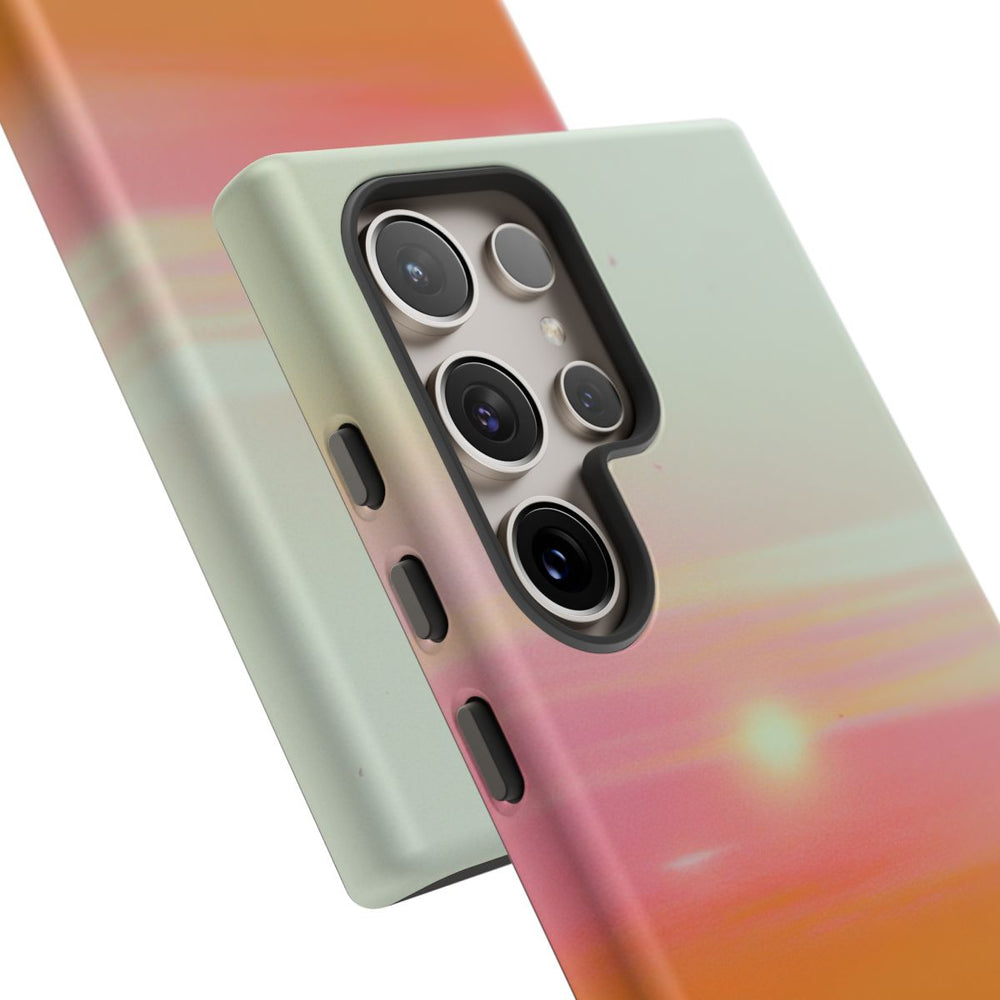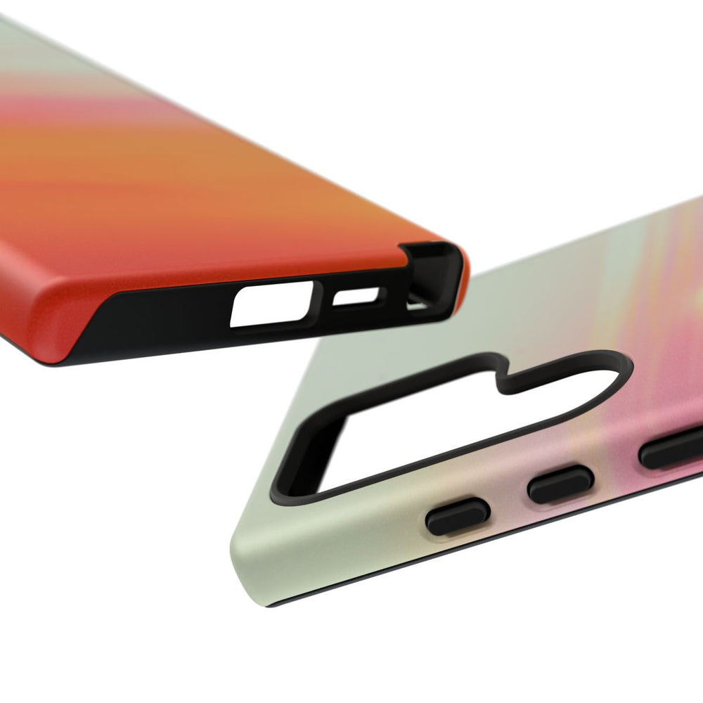 Dit telefoonhoesje heeft een abstract ontwerp met een vloeiende kleurovergang die doet denken aan een zonsondergang. Warme tinten oranje, rood en roze lopen subtiel over in lichtere kleuren zoals crème en lichtgroen. Het geheel zorgt voor een zachte, dromerige uitstraling met een stralend, zonachtig accent in het midden. Het hoesje bestaat uit twee lagen: een stevige polycarbonaat buitenkant en een TPU binnenzijde, voor extra bescherming en duurzaamheid. Bovendien ondersteunt het hoesje draadloos opladen.