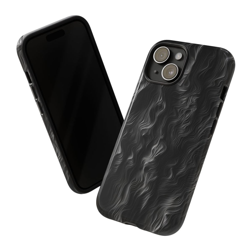 Dit hoesje heeft een abstract patroon van golvende, vloeiende lijnen in verschillende tinten zwart en grijs. De lijnen zorgen voor een gelaagd en textuurrijk effect met soepele kleurverlopen en een gevoel van diepte. De uitstraling is dynamisch en organisch, waarbij donkere tinten overheersen. Het patroon is gedrukt op een glanzend, stevig hoesje met een buitenkant van polycarbonaat en een binnenzijde van TPU. Deze dubbele laag biedt extra bescherming en ondersteunt draadloos opladen. Het hoesje is ontworpen voor duurzaamheid en bestand tegen gebruik buitenshuis.