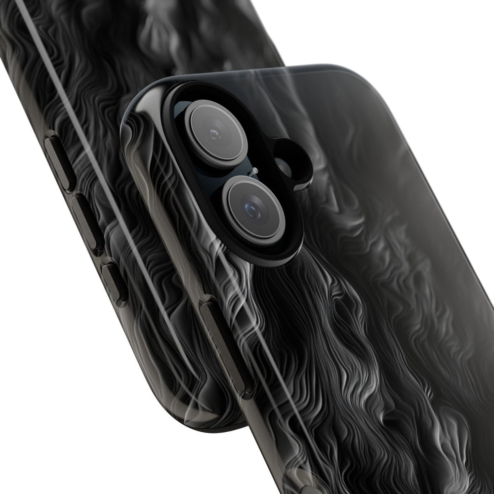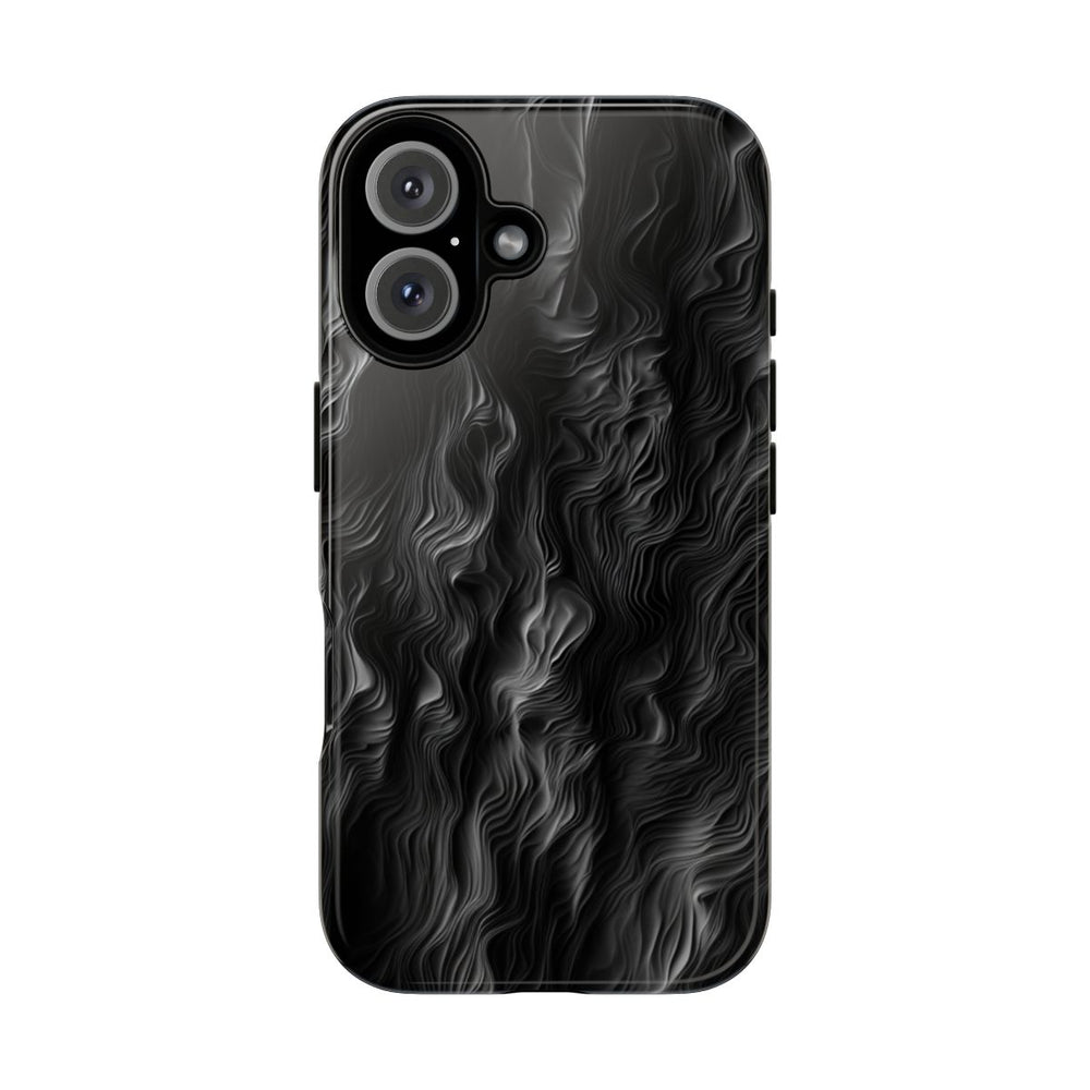 Dit hoesje heeft een abstract patroon van golvende, vloeiende lijnen in verschillende tinten zwart en grijs. De lijnen zorgen voor een gelaagd en textuurrijk effect met soepele kleurverlopen en een gevoel van diepte. De uitstraling is dynamisch en organisch, waarbij donkere tinten overheersen. Het patroon is gedrukt op een glanzend, stevig hoesje met een buitenkant van polycarbonaat en een binnenzijde van TPU. Deze dubbele laag biedt extra bescherming en ondersteunt draadloos opladen. Het hoesje is ontworpen voor duurzaamheid en bestand tegen gebruik buitenshuis.
