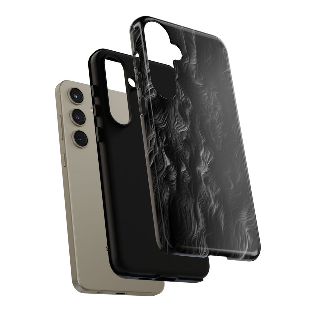 Dit hoesje heeft een abstract patroon van golvende, vloeiende lijnen in verschillende tinten zwart en grijs. De lijnen zorgen voor een gelaagd en textuurrijk effect met soepele kleurverlopen en een gevoel van diepte. De uitstraling is dynamisch en organisch, waarbij donkere tinten overheersen. Het patroon is gedrukt op een glanzend, stevig hoesje met een buitenkant van polycarbonaat en een binnenzijde van TPU. Deze dubbele laag biedt extra bescherming en ondersteunt draadloos opladen. Het hoesje is ontworpen voor duurzaamheid en bestand tegen gebruik buitenshuis.